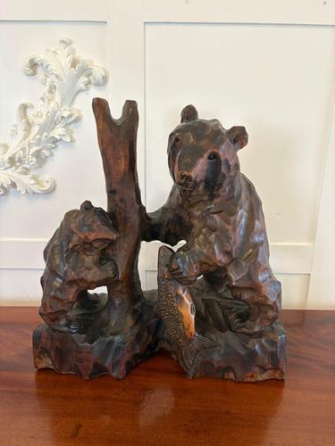 Large Antique Edwardian Quality Carved Linden Wood Japanese Bear Carrying a Fish