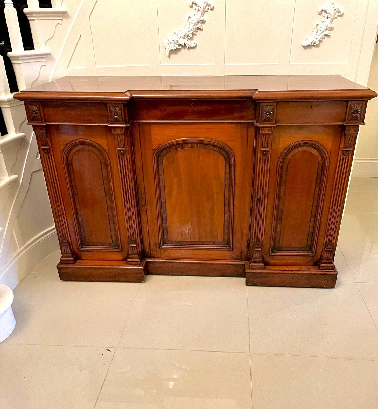 Quality mid 19th Century Victorian antique mahogany breakfront sideboard having a quality mahogany top with a moulded edge, three frieze drawers above three mahogany arched panelled crossbanded cupboard doors with quality mahogany carvings opening to reveal a fitted interior of sliding trays and shelves. It is raised on a plinth base.
