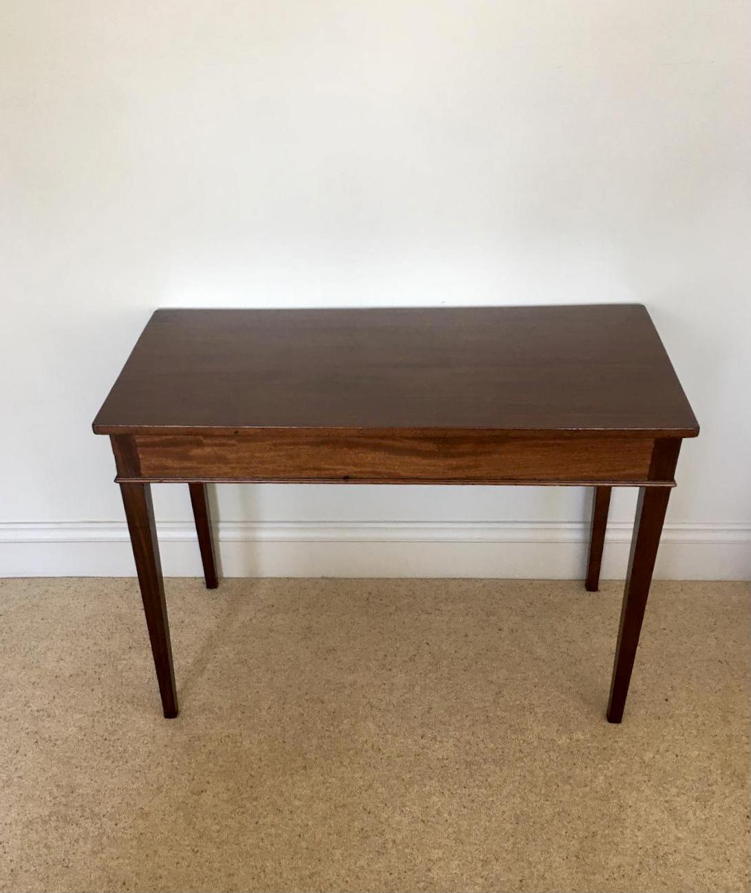 Antique George III mahogany side/lamp table having a quality mahogany top and mahogany frieze. It is supported by square tapering legs and is in a lovely original condition with a rich patina.