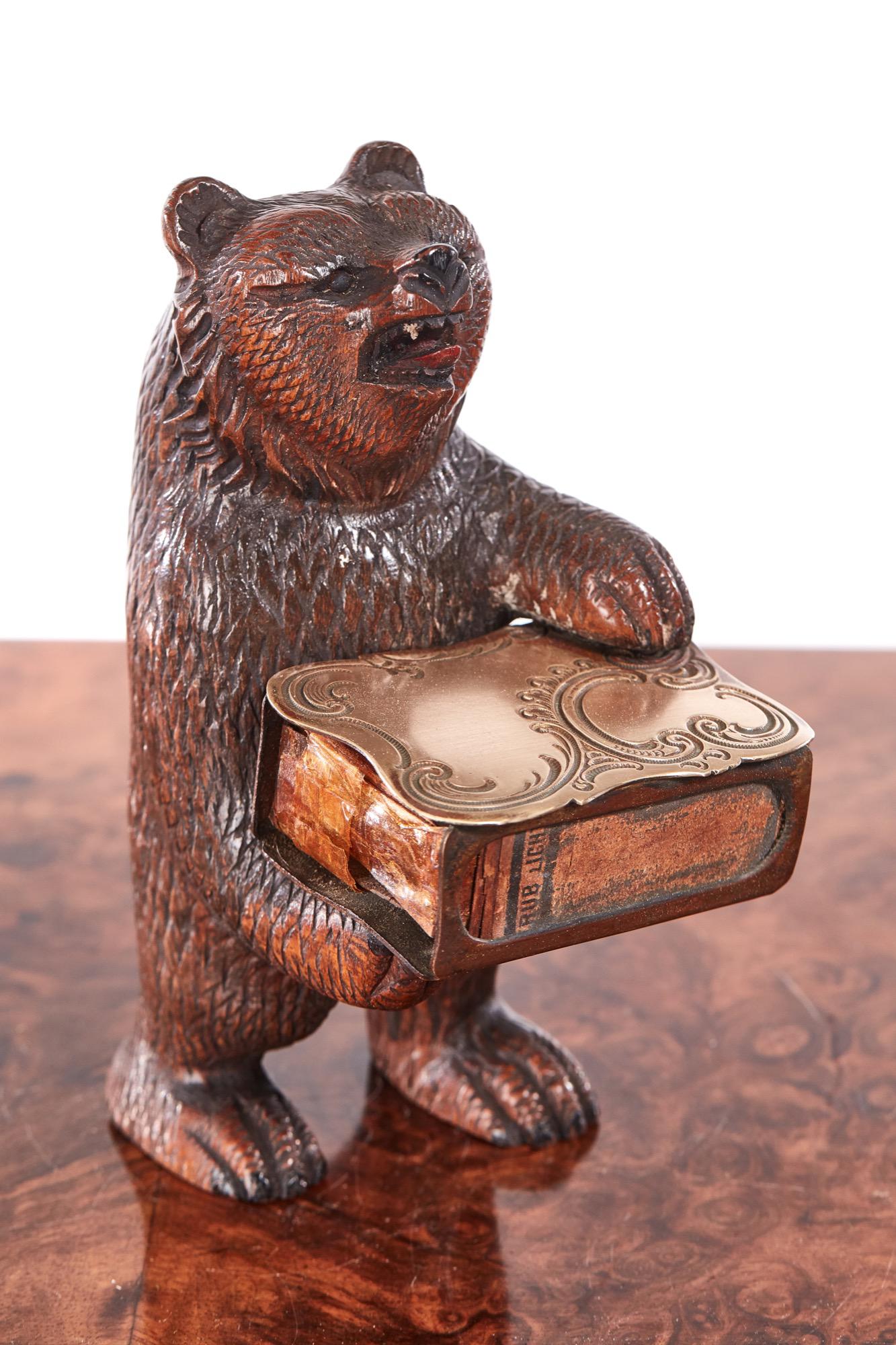 Quality 19th Century antique carved black forest bear holding a brass matchbox.