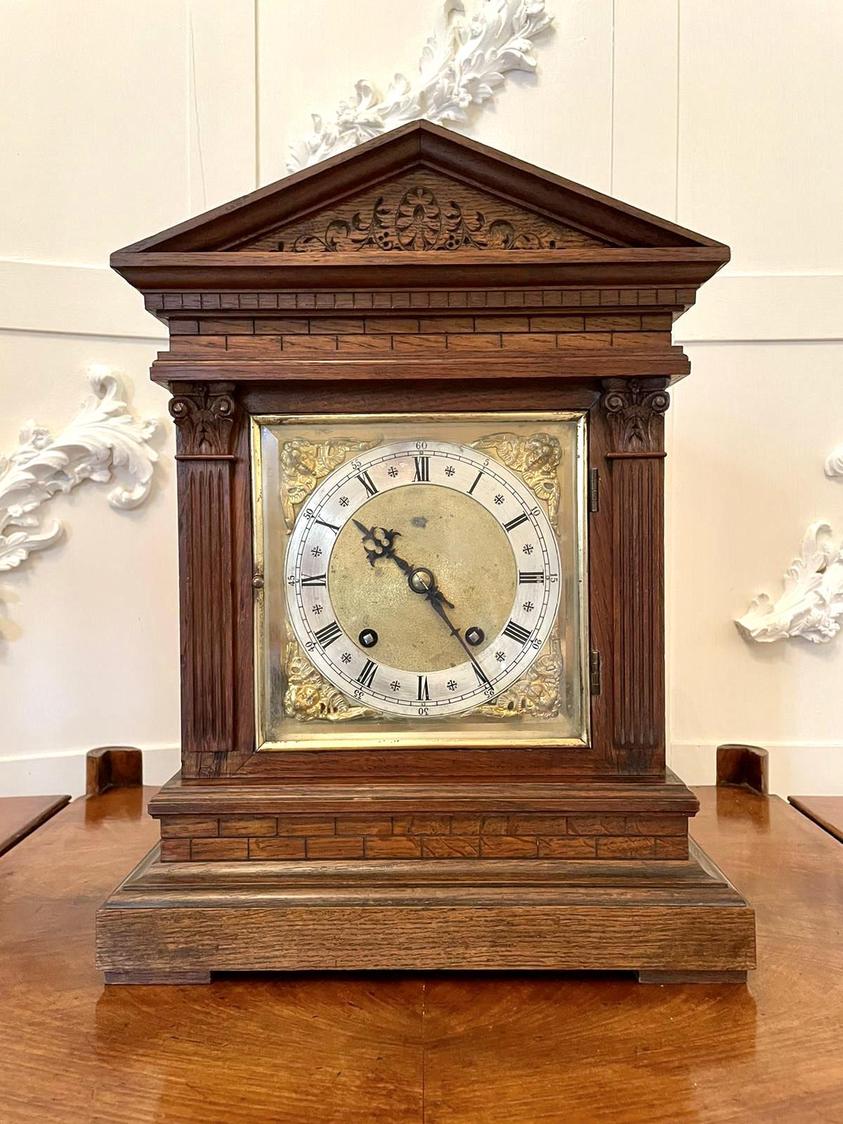 Antique carved oak brass face eight-day mantel clock having a brass face with a silver chapter ring, original hands, and brass bezel. It has an eight-day movement striking on the hour and half hour. The case has a marvelous carved oak architectural top above a moulded frieze with two reeded columns and carved capitals. It stands on a moulded plinth with original turned feet.