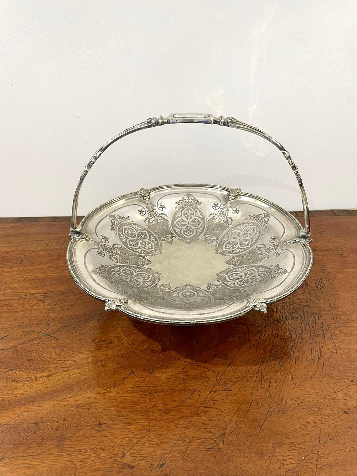 Antique Edwardian quality engraved silver plated cake basket having an ornate swing handle and lovely engraved ornate basket raised on shaped feet.