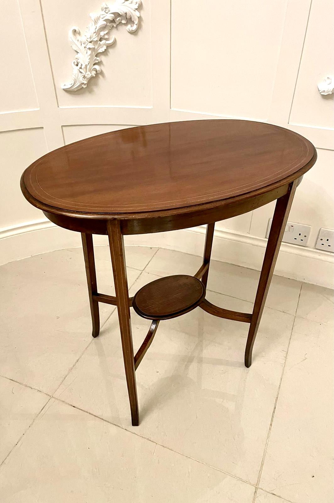 Antique Edwardian quality mahogany inlaid oval lamp table having a quality mahogany top with satinwood inlaid stringing and a moulded edge with an oval frieze standing on shaped spade legs with satinwood stringing united by shaped stretchers and an oval under-tier united with a moulded edge.