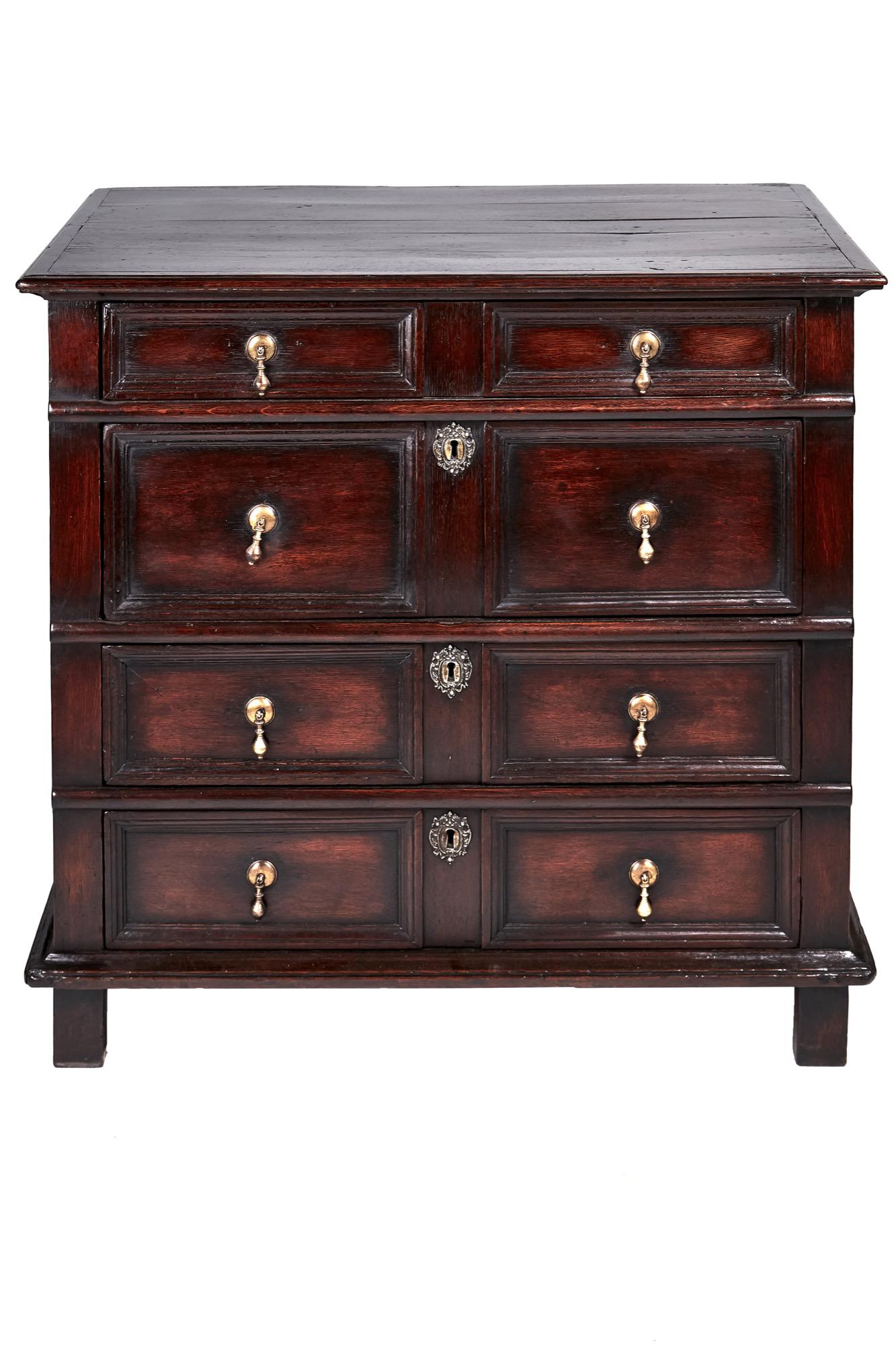 Antique English 17William and Mary Jacobean oak chest of drawers having a beautiful top and panelled sides. The four long drawers have moulded fronts and very pretty original brass teardrop handles. The original three ornate brass locks are delightfully crafted in a crest shape.