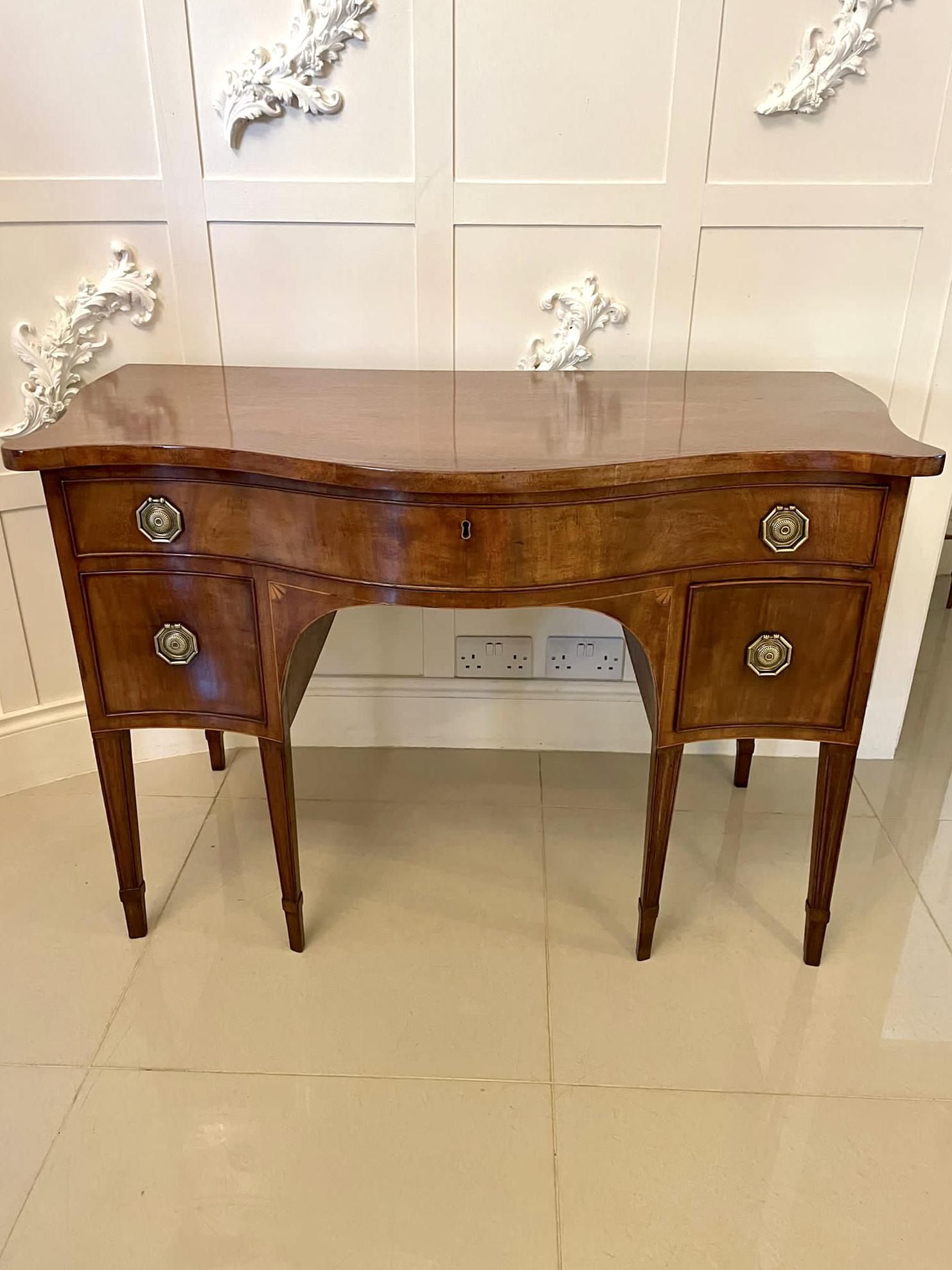 Antique George III 18th century quality mahogany serpentine shaped side table having a quality serpentine shaped top above one long and two short serpentine shaped cockbeeded drawers with original brass handles. It boasts an attractive serpentine shaped inlaid mahogany frieze to the centre and stands on six elegant square tapering moulded legs with square feet.