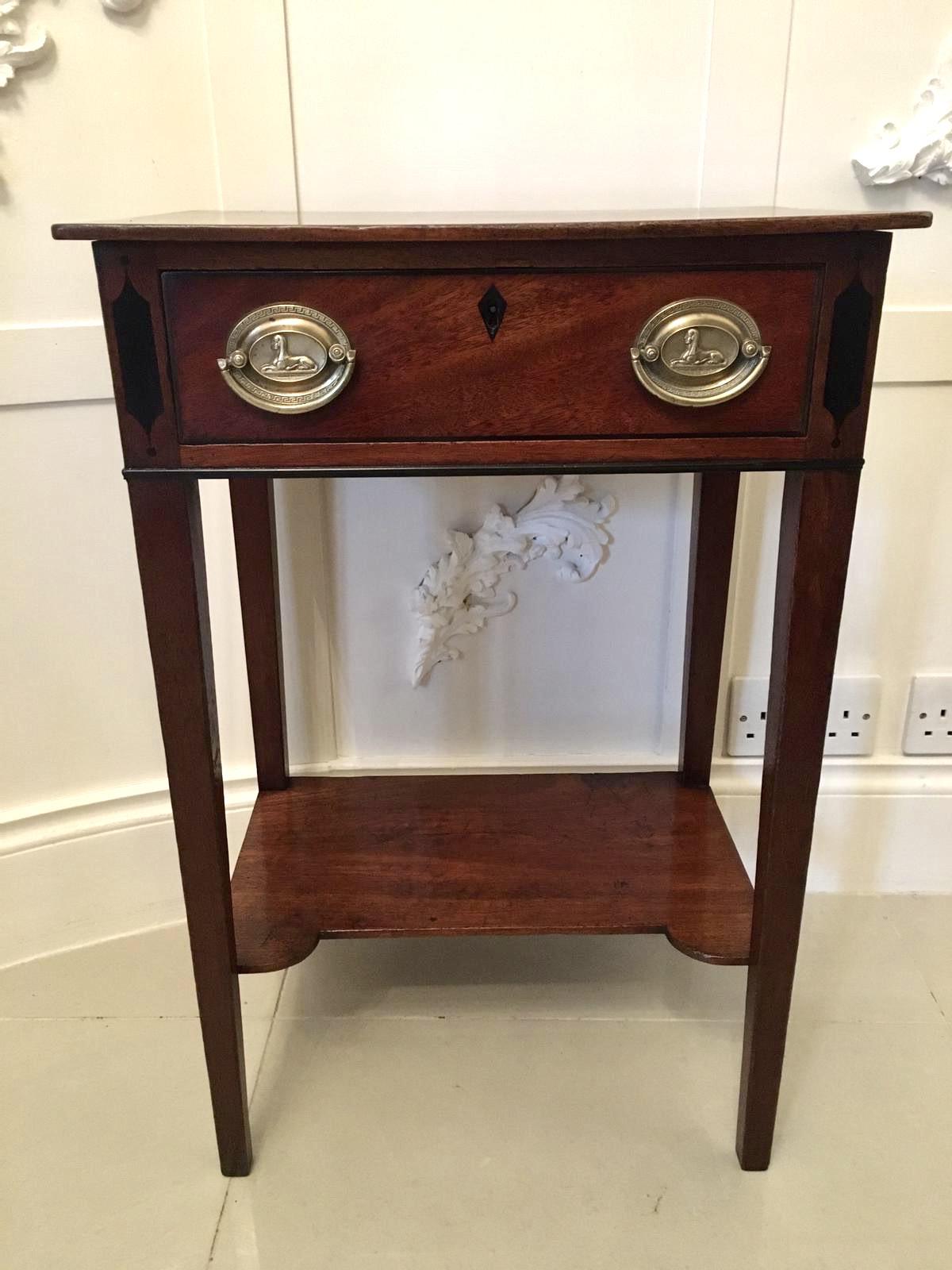 Antique George III mahogany lamp/side table having a beautiful quality mahogany top above one long drawer with original oval brass handles. It stands on four elegant squared tapering inlaid legs and is united by a shaped under tier.
