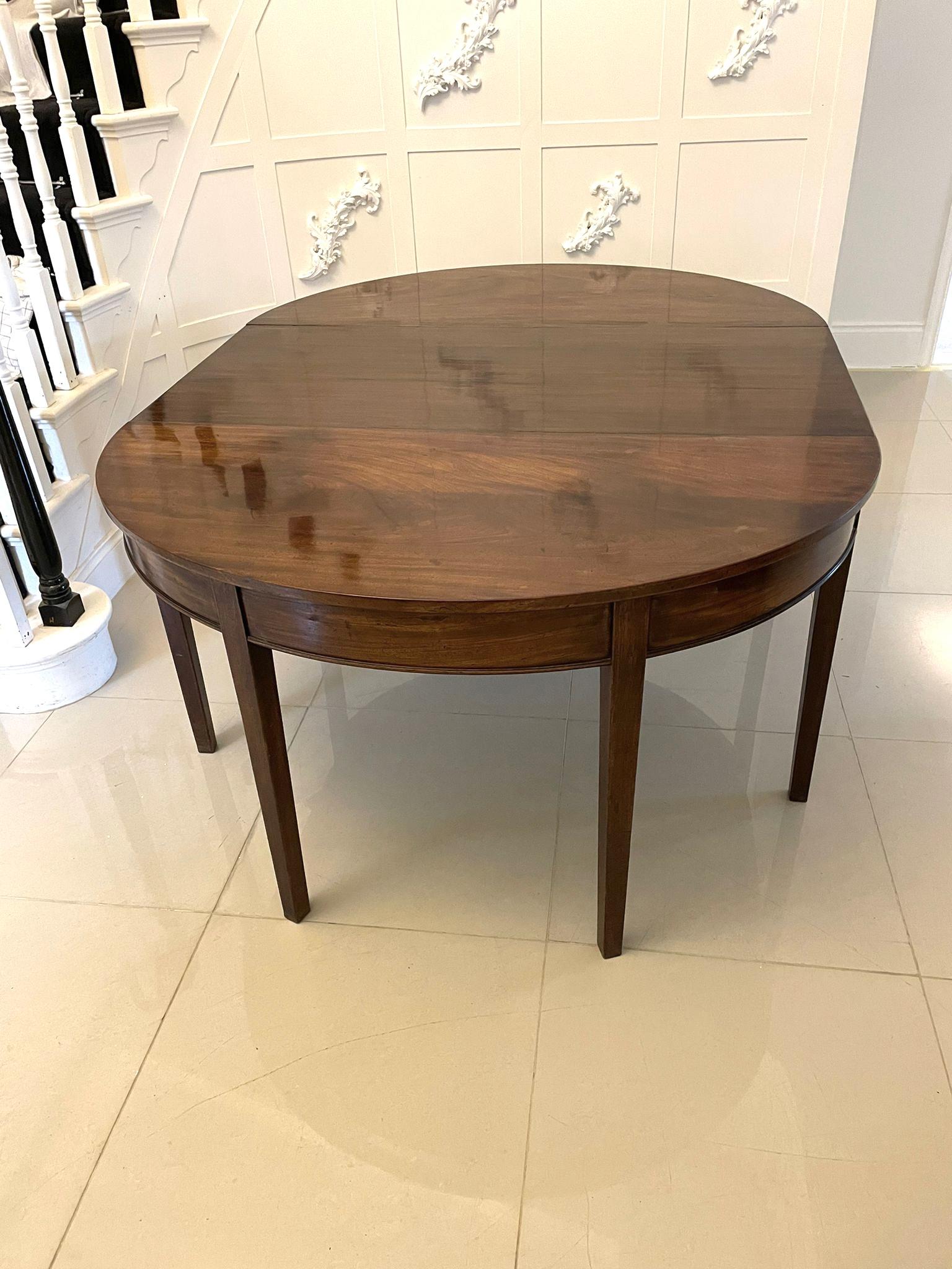 Antique George Iii quality mahogany D end dining table having a quality shaped mahogany top with one extra leaf, mahogany frieze and standing on square tapering legs. This table also makes a centre table and a pair of console tables.