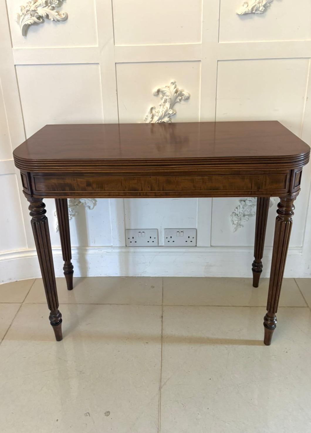 An antique George III Gillows stamped mahogany console hall card table of excellent quality featuring a fold over top and elegant reeded legs.