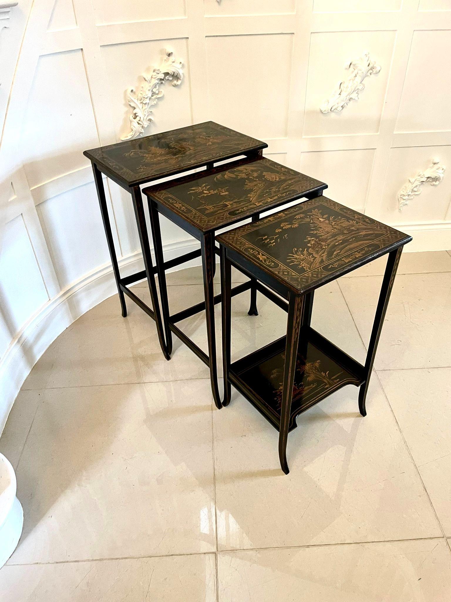 Antique nest of 3 quality chinoiserie decorated tables having rectangular shaped tops boasting a delightful black and gold background with quality chinoiserie decoration and a moulded edge standing on 4 square elegant tapering black and gold legs united by stretchers and featuring one with a pretty chinoiserie undertier.