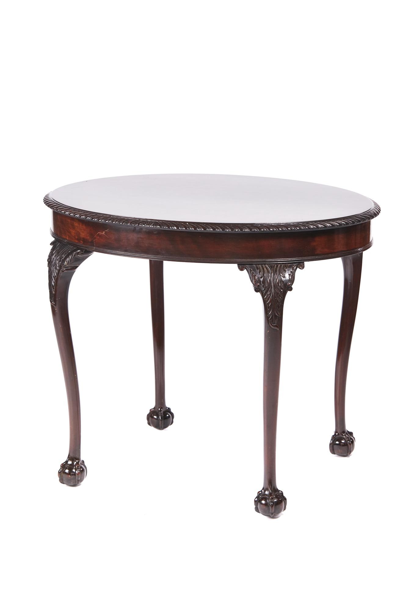 This is a 19th Century antique oval carved mahogany centre table with a very attractive figured mahogany top and carved moulded edge. It is standing on four lovely carved claw and ball legs.