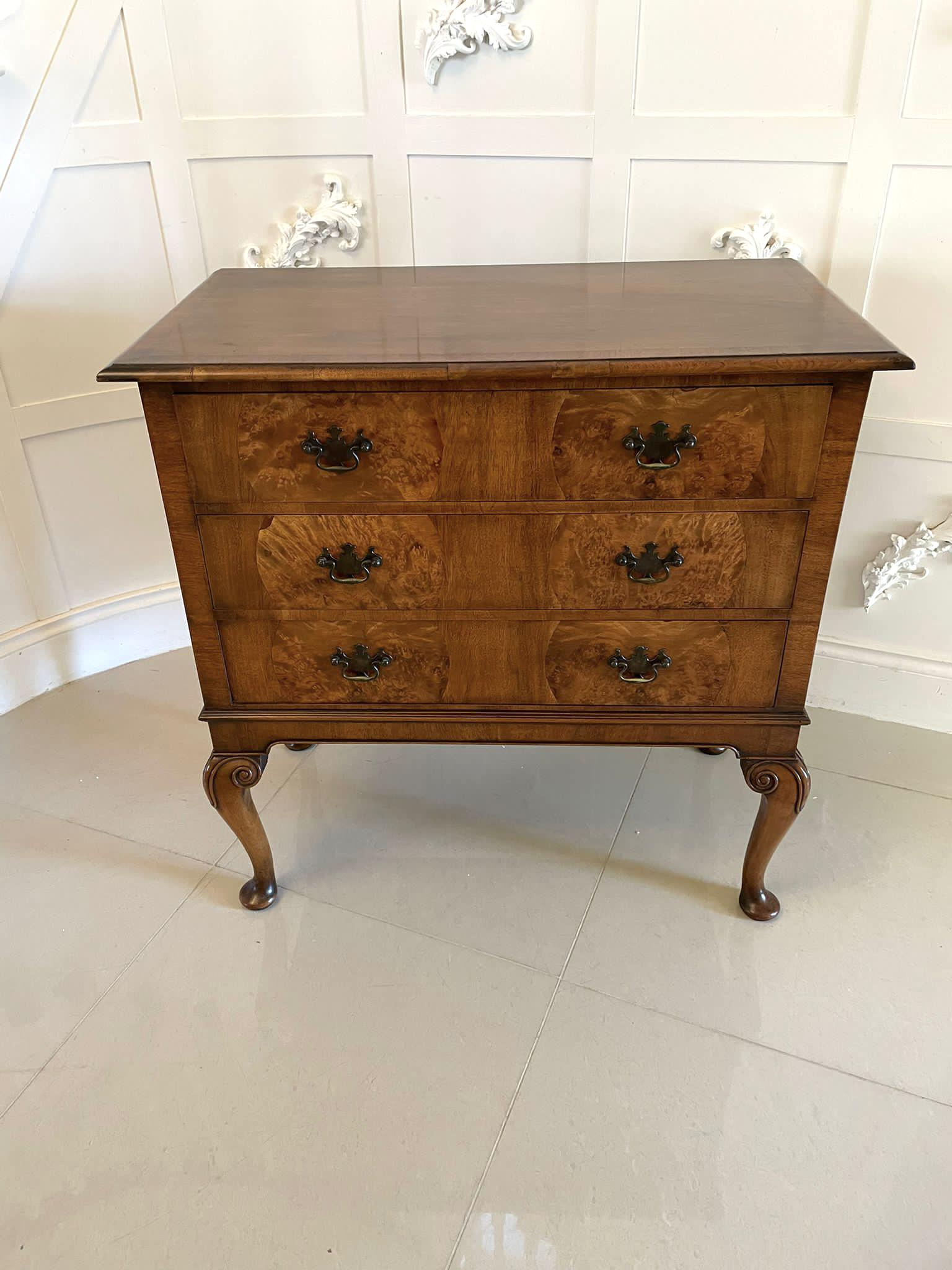 Antique quality burr walnut chest on stand having a quality rectangular pretty crossbanded burr walnut top with a moulded edge above three long burr walnut drawers with original brass handles, standing on four shaped carved solid walnut cabriole legs with pad feet.