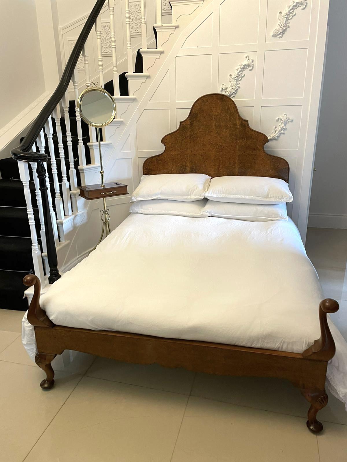 Antique quality burr walnut double bed having a quality shaped burr walnut moulded edge headboard, original iron side rails, burr walnut shaped footboard with shaped uprights standing on shaped carved solid walnut cabriole legs with pad feet.
