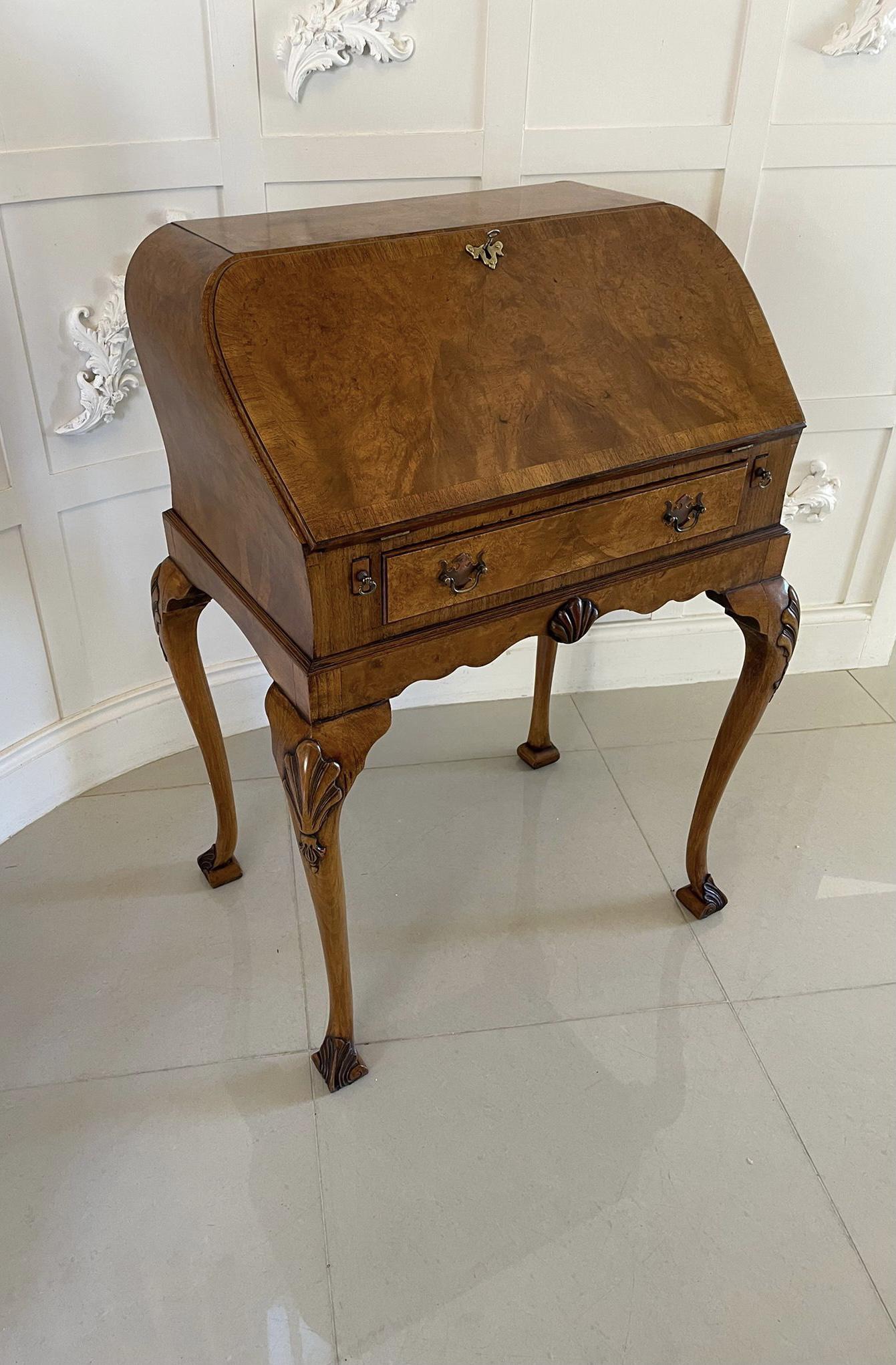 Antique quality burr walnut shaped bureau having a quality crossbanded burr walnut top above a shaped burr walnut crossbanded fall opening to reveal a beautiful fitted interior consisting of a central door flanked by pigeon holes and four lovely shaped burr walnut drawers with original brass handles, brown leather writing surface above one long burr walnut drawer with original brass handles above a shaped carved walnut frieze. The burr walnut sides are fantastic and it stands on four shaped carved solid walnut cabriole legs with scroll feet.