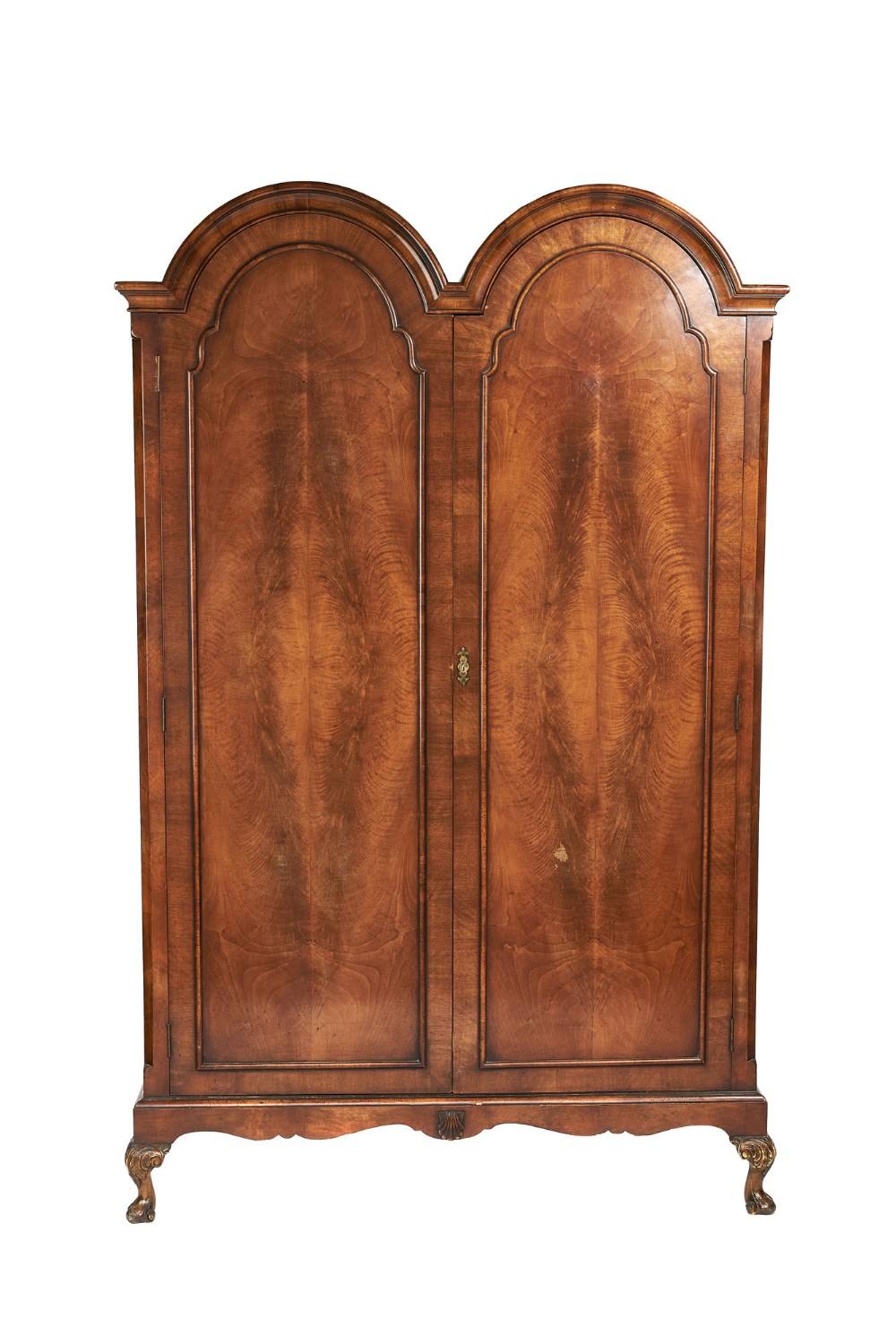 Antique quality burr walnut two door double dome wardrobe having a quality double dome shaped moulded cornice above a pair of crossbanded burr walnut shaped moulded doors opening to reveal a large hanging storage compartment. It boasts canted corners and stands on quality carved solid walnut shaped cabriole legs with scroll feet united by a shaped carved walnut apron.