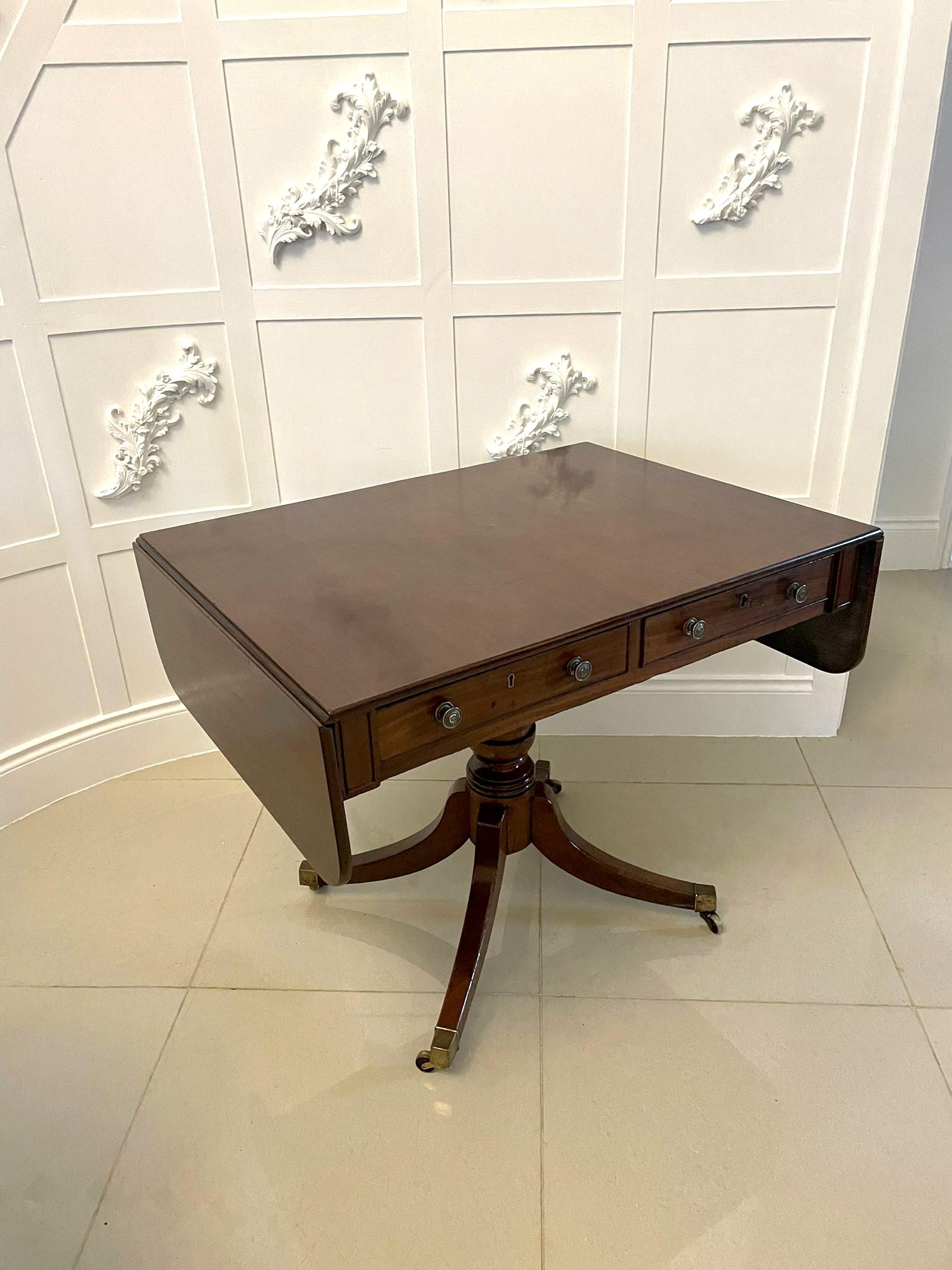 Early 19th Century Georgian / Regency antique quality freestanding mahogany sofa table having a quality mahogany top with two drop leaves above two frieze drawers and two dummy drawers with a cockbeeded edge, brass handles and supported by a turned pedestal column standing on four elegant shaped sabre legs with original brass castors