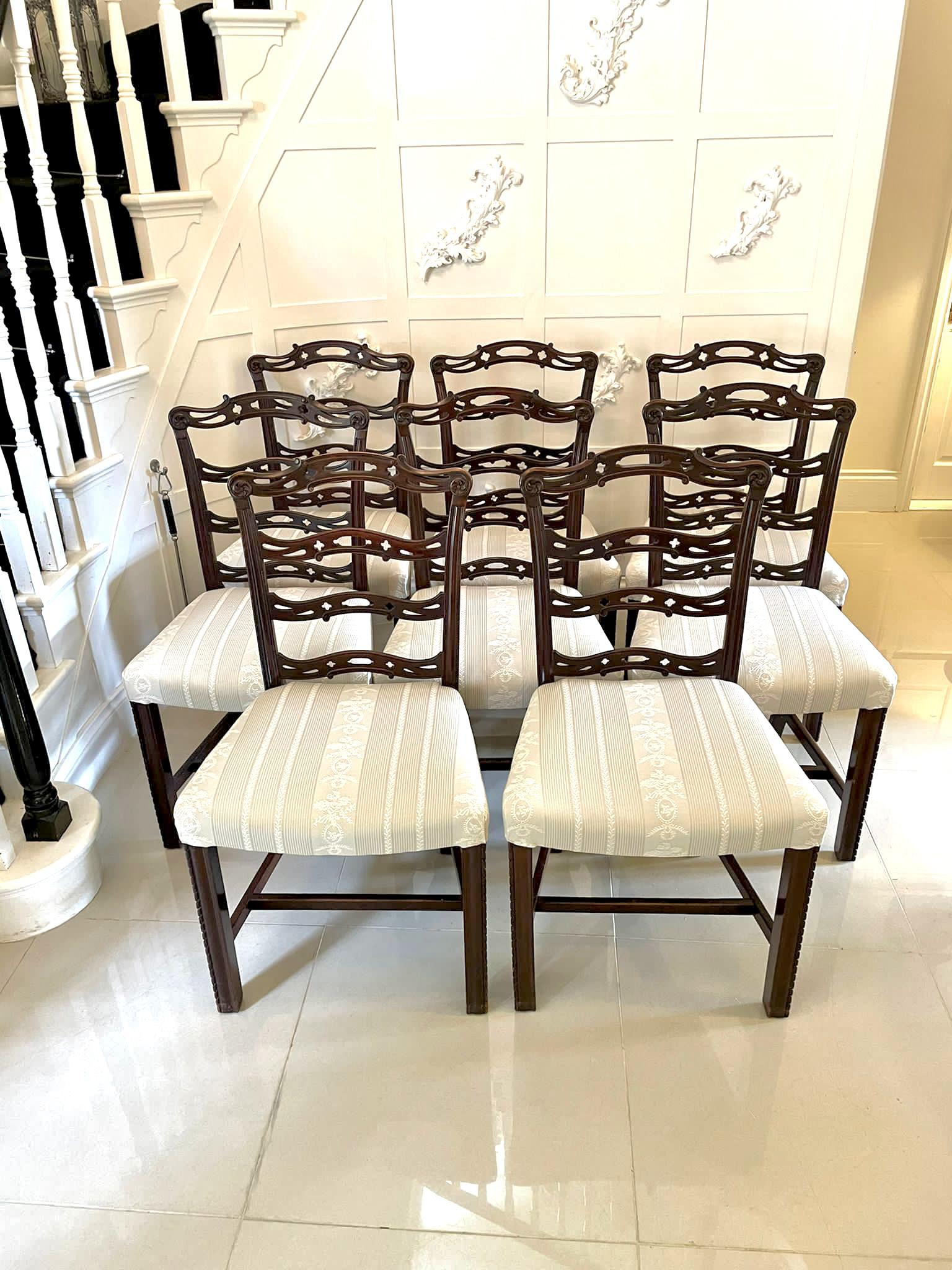 Antique set of eight quality 19th century mahogany ladder back chairs having a fantastic quality shaped carved mahogany ladder back with reeded supports, newly reupholstered seats in a quality stylish fabric. They stand on lovely square carved mahogany legs to the front and out swept back legs united by mahogany stretchers.