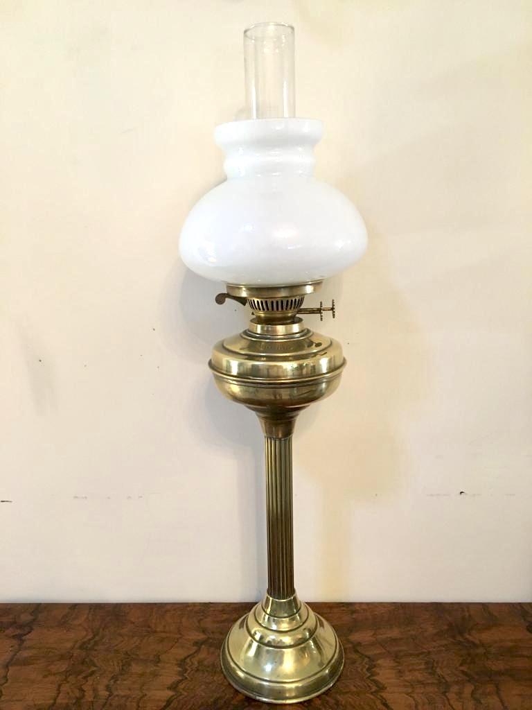 Late 19th Century Victorian antique brass oil lamp with the original white glass shade and chimney. It boasts a duplex burner, brass front with reeded brass column and stands on a round brass base.