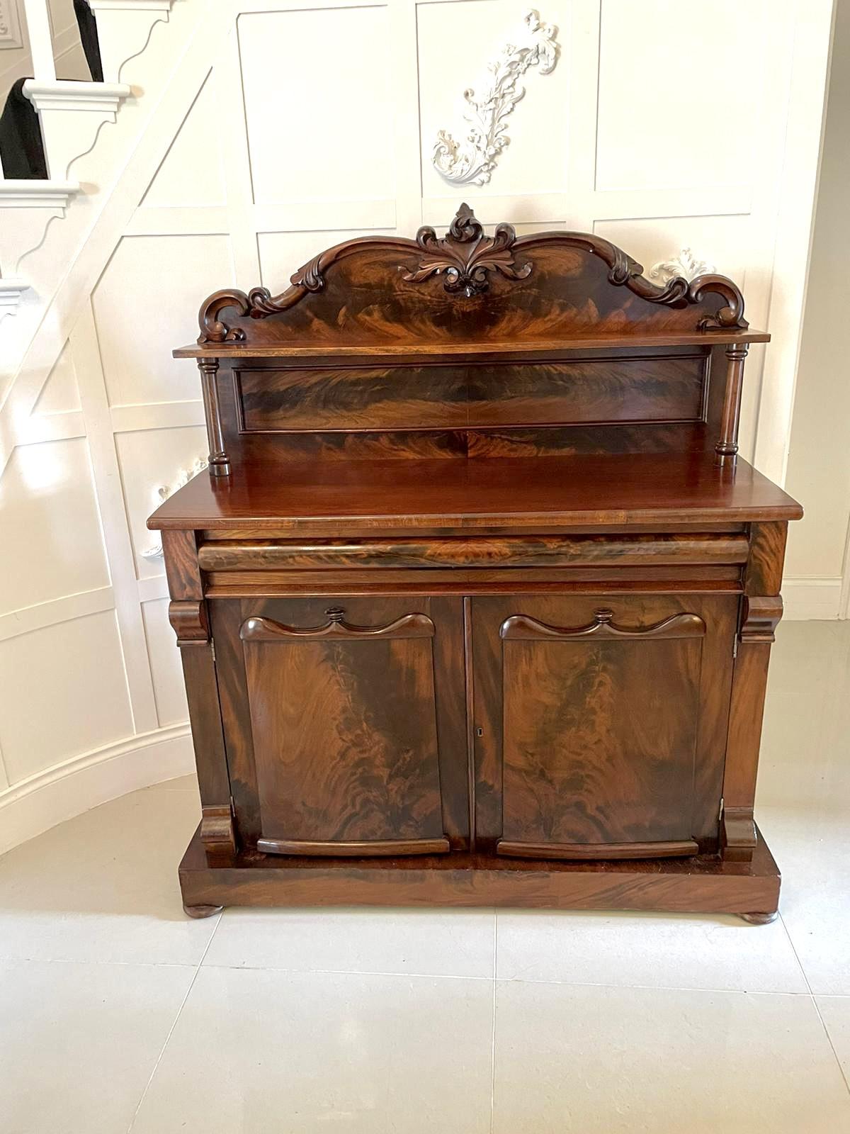 Antique Victorian carved mahogany sideboard having a quality attractive shaped carved mahogany back with a shelf supported by turned columns above a lovely mahogany top, shaped figured mahogany drawer to the frieze above a pair of figured mahogany shaped panel doors opening to reveal a shelf interior flanked by shaped mahogany supports and standing on a plinth base with bun feet.