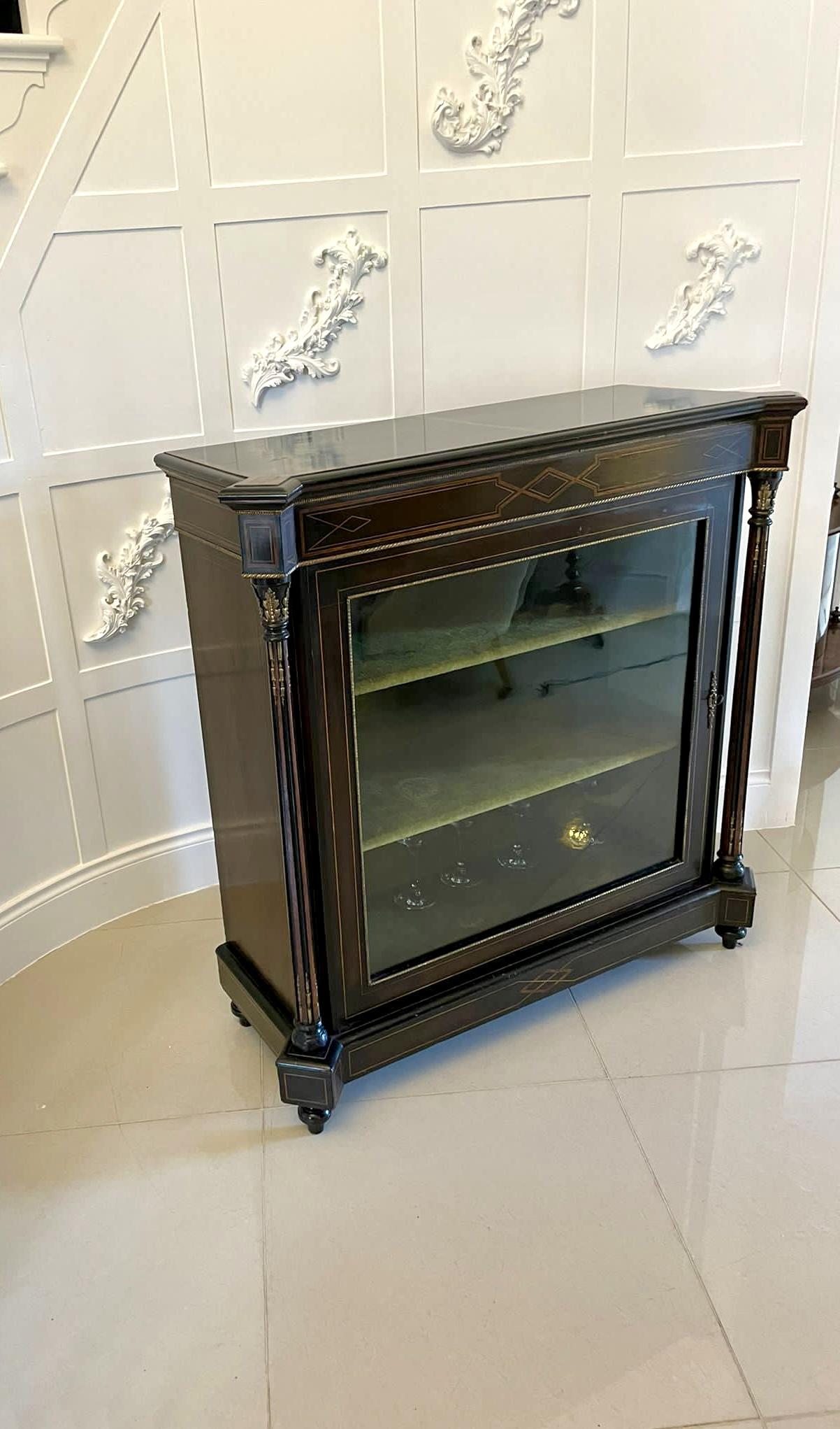 Antique Victorian ebonised and inlaid display cabinet with an exquisitely inlaid amboyna top, frieze, plinth and sides. One large glazed door to the front and two superior inlaid columns with quality ormolu mounts. It stands on a plinth base with original turned feet.