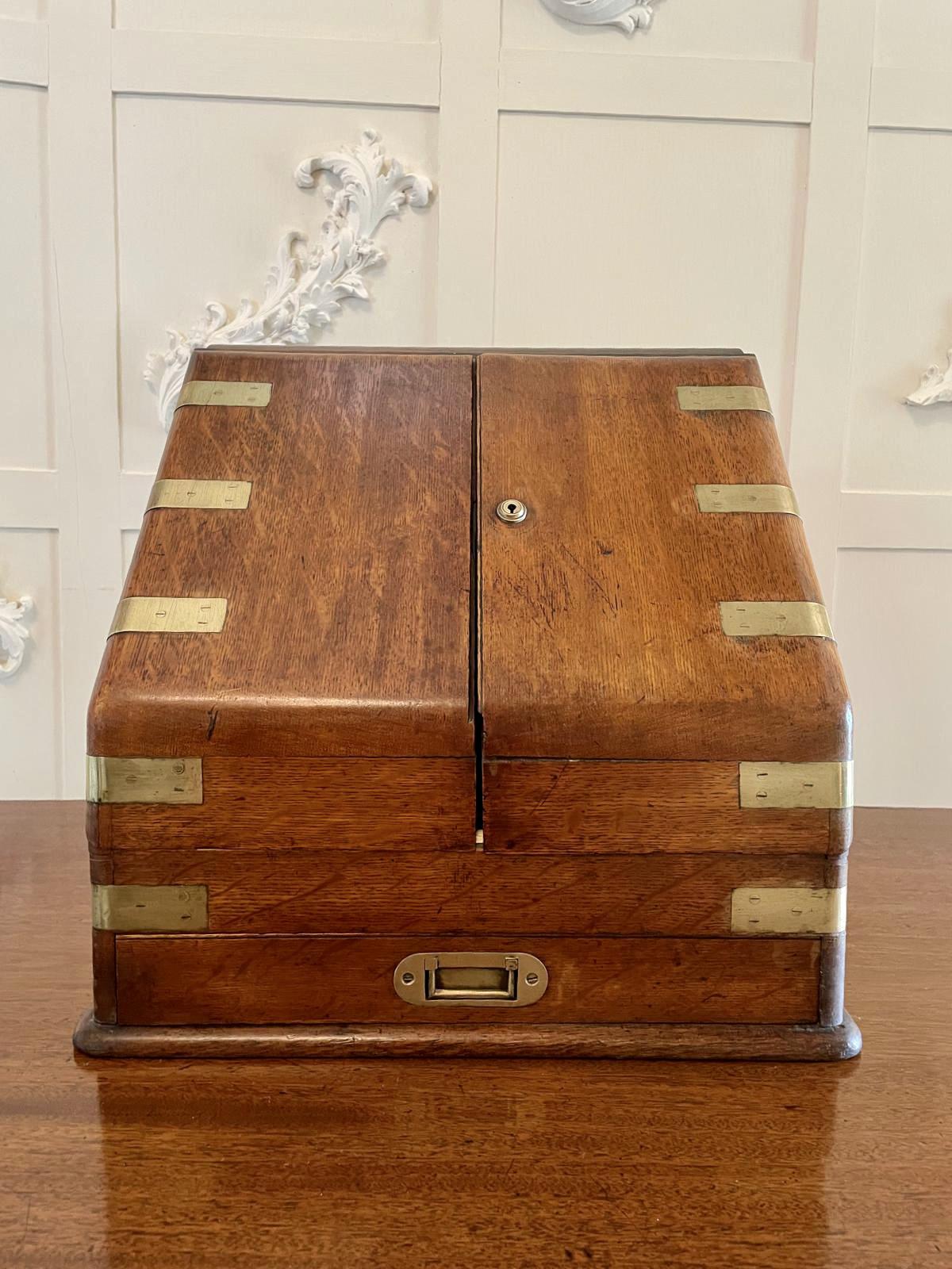 Antique Victorian figured oak military stationery box having two figured oak doors with military brass bands opening to reveal a lovely fully fitted interior comprising a date, day and month calendar, shaped letter rack, pen tray, sliding paper pad, two original inkwells and a secret compartment with one long drawer beneath with original brass military handle.