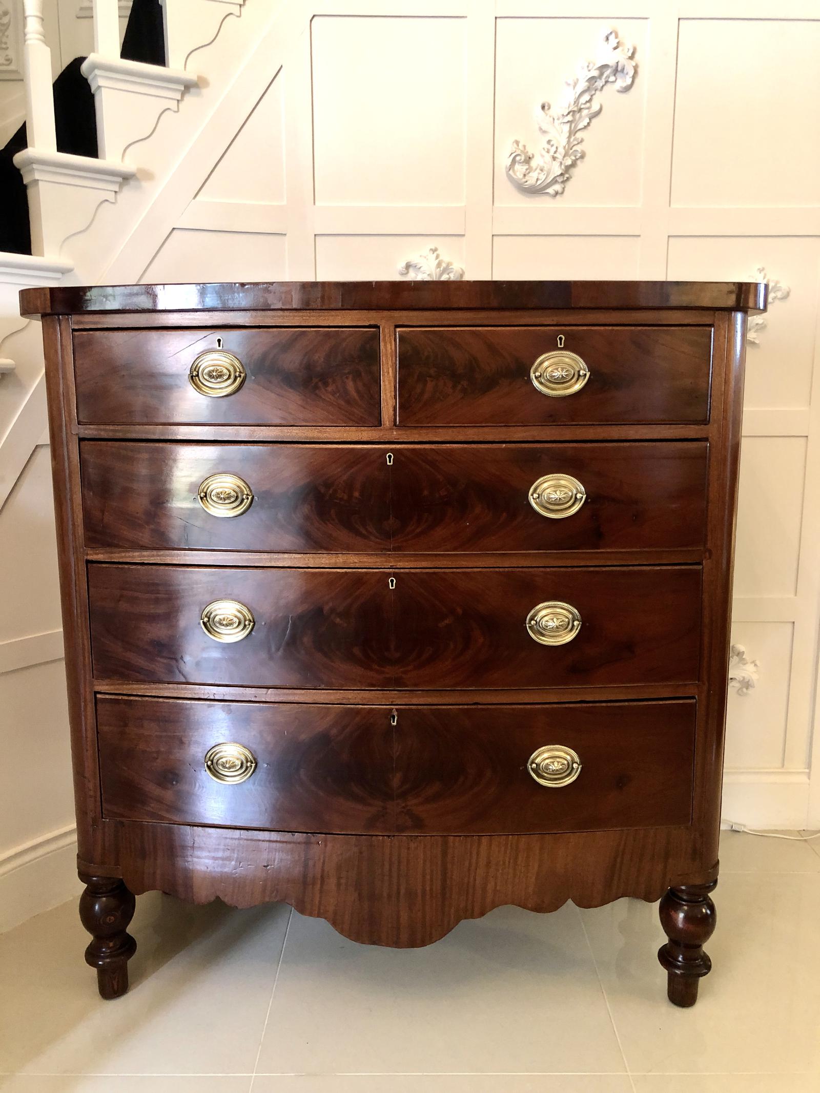 Antique Victorian mahogany Scottish bow front chest of drawers having a figured mahogany bow fronted top, two short and three long figured mahogany drawers all with pretty oval brass handles. It stands on lovely original turned mahogan feet united by a shaped apron.