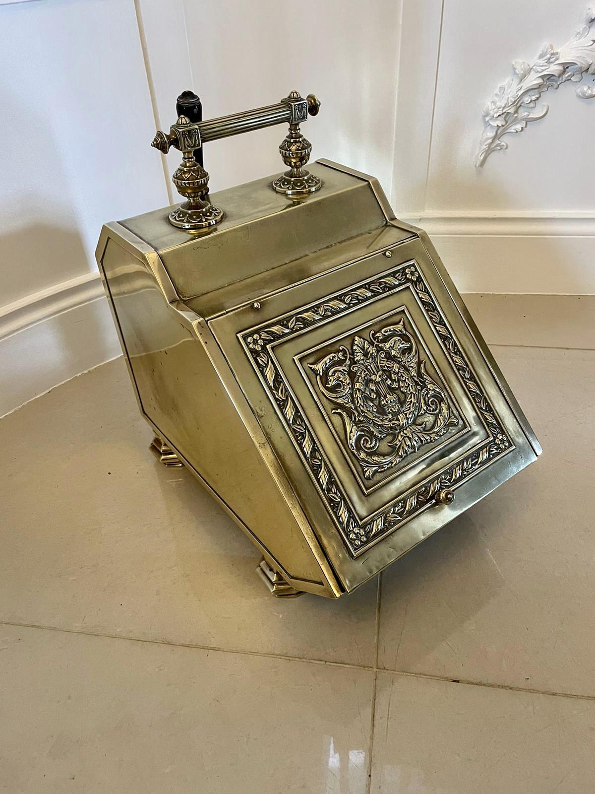 19th Century Victorian antique quality brass coal scuttle having a quality ornate brass lift up lid opening to reveal the original liner, carrying handle to the top with brass shovel and raised on brass feet.