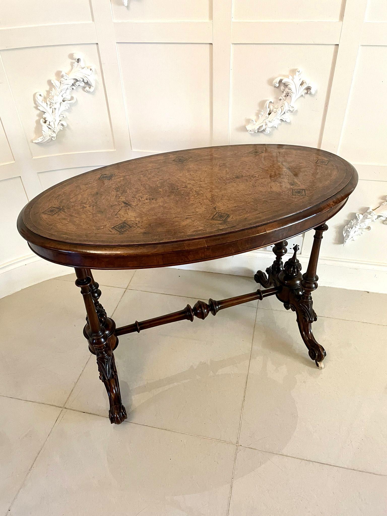 Antique Victorian quality burr walnut inlaid oval centre table having an oval quality burr walnut Tunbridgeware inlaid top with a moulded edge, oval frieze supported by four turned shaped solid walnut columns, carved walnut finials and standing on shaped carved walnut cabriole legs with original castors united by a shaped carved turned stretcher.