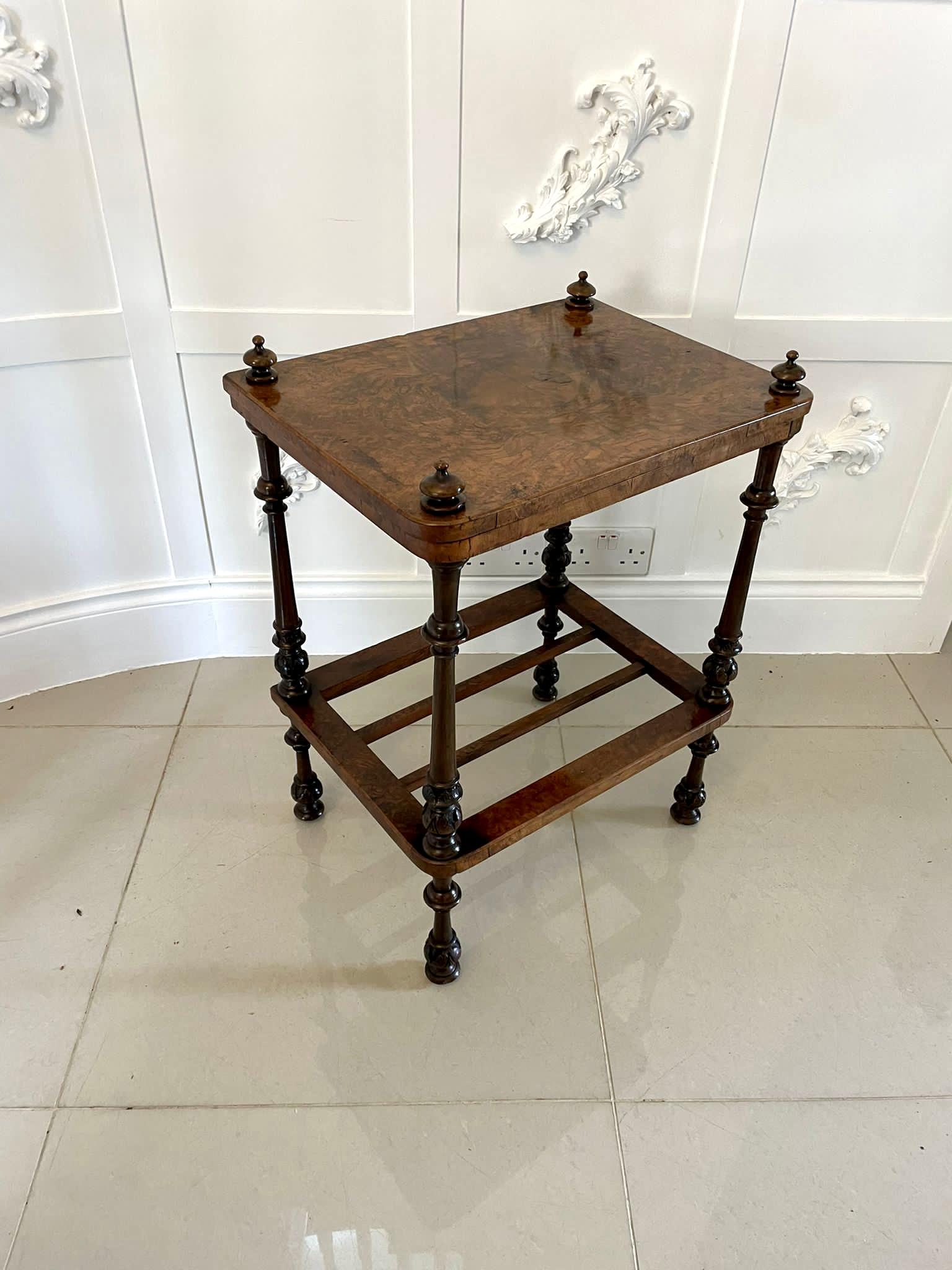 Antique Victorian quality burr walnut lamp table having a quality burr walnut top with four original turned finials supported by four turned solid walnut columns, burr walnut under-tier standing on four elegant shaped turned legs