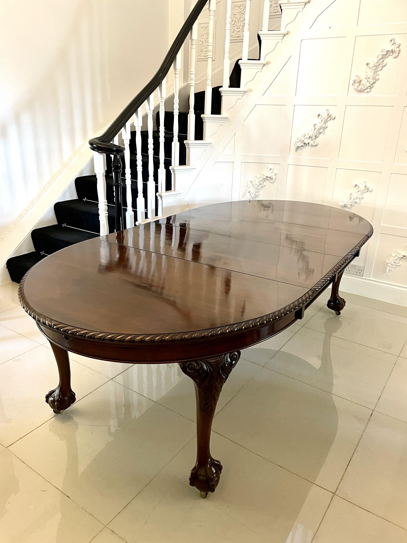 Antique Victorian quality carved mahogany extending dining table having a quality figured mahogany D end shaped top with a delightful carved edge and two original extra leaves, mahogany frieze, original winding mechanism and handle standing on fantastic carved mahogany legs with claw and ball feet original brass castors.