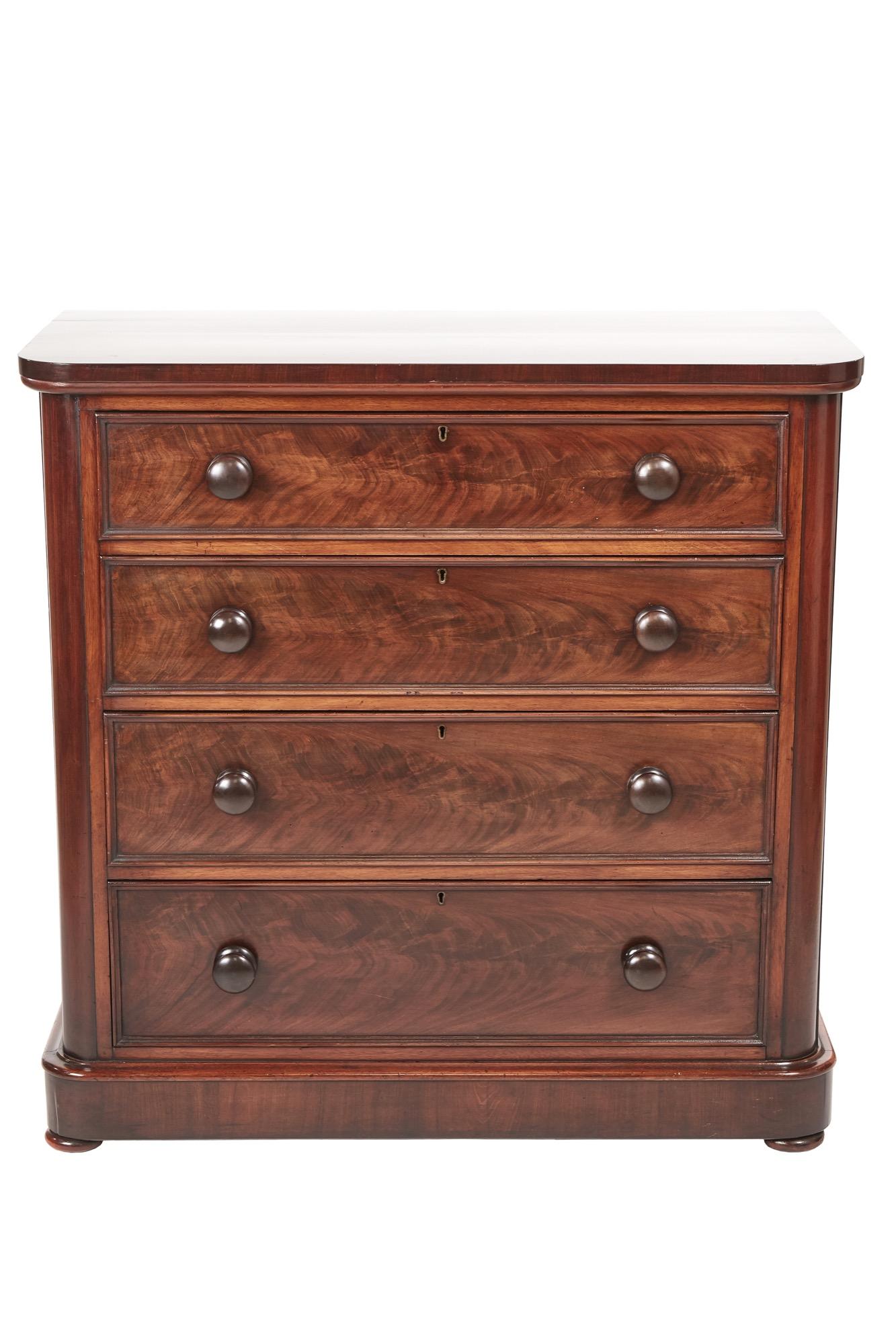Antique Victorian quality mahogany chest of drawers having a quality figured mahogany top above 4 long figured mahogany drawers with original turned mahogany knobs. The moulded drawers to the front look very grand and it stands on a plinth base with original bun feet.