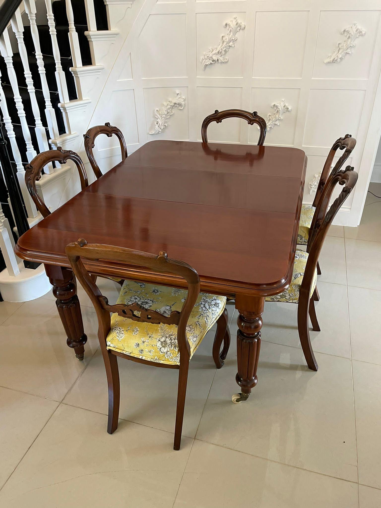 Antique Victorian quality mahogany extending dining table having a quality extending mahogany top with the original extra leaf and a moulded edge standing on turned tapering reeded legs with original brass castors and porcelain wheels. Original winding mechanism and handle.
