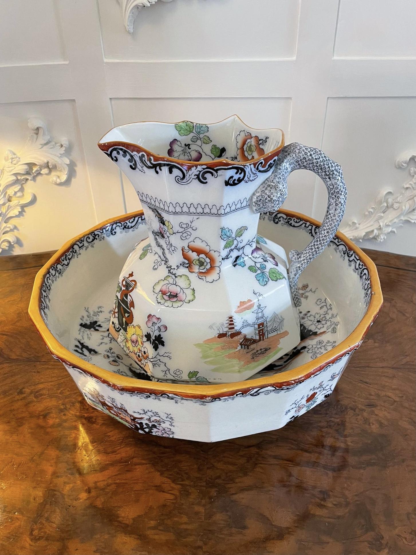 Antique Victorian quality masons Ironstone jug and bowl set having a quality shaped jug and bowl set in wonderful blue, green, red, yellow, white and orange colours