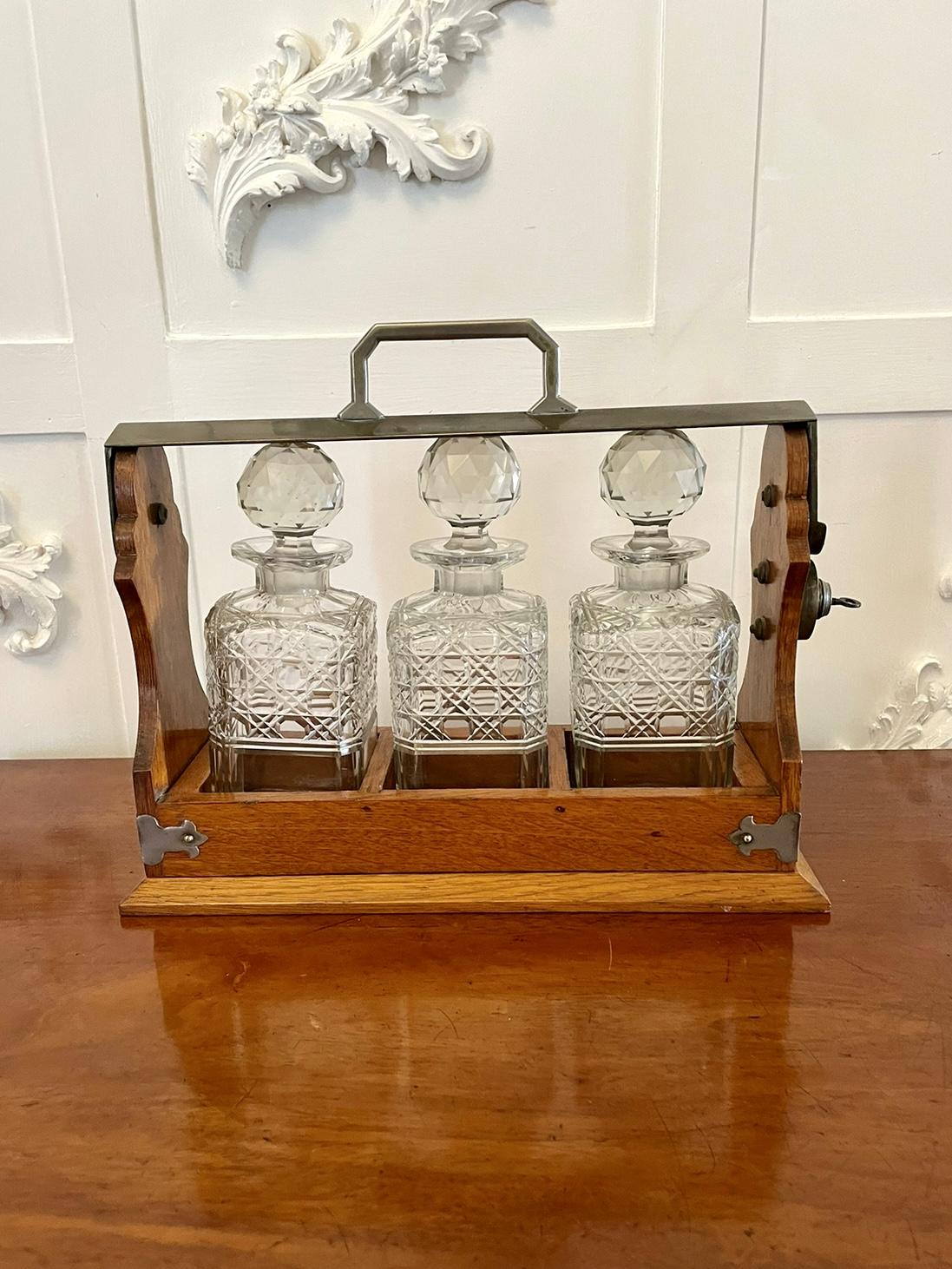 Mid 19th Century Victorian antique quality oak tantalus having an oak tantalus with a plated swing handle and original key with ts.hree cut glass decanters with original stopper