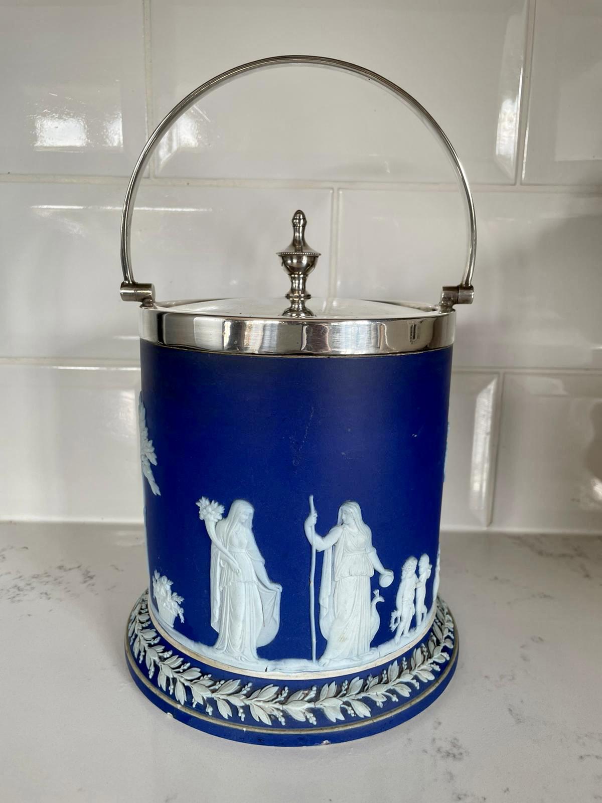 Antique wedgwood jasperware biscuit barrel decorated with classical scenes in a white cameo and a blue background and has a swing silver plated handle. The base is marked Wedgwood.