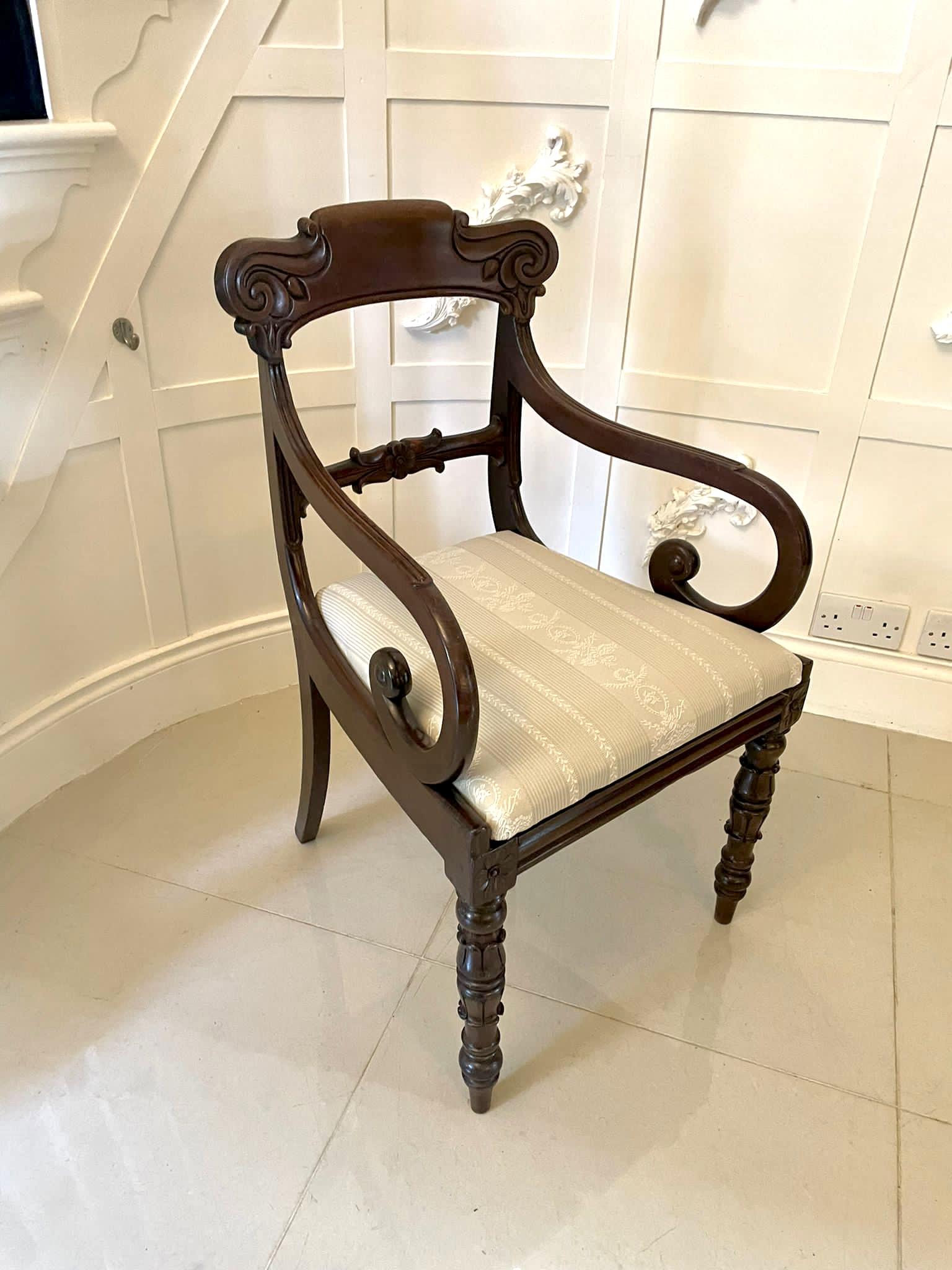 19th Century William IV antique quality mahogany desk chair having a quality carved mahogany shaped top rail and centre splat with shaped scrolled arms. The drop in seat has been newly reupholstered in a quality fabric and boasts a moulded frieze standing on attractive shaped carved tulip turned legs to the front and out swept back legs.