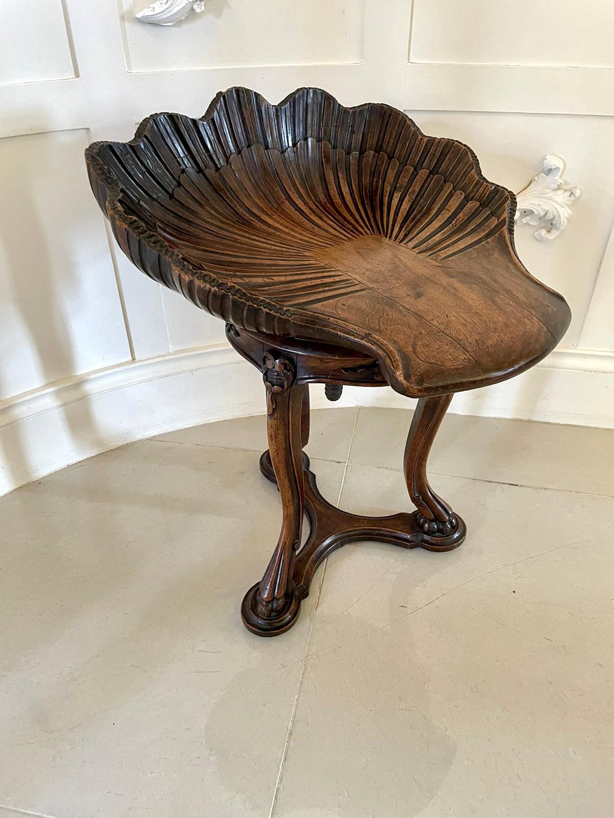 Fantastic Italian antique Victorian carved walnut Grotto revolving music stool having a fantastic quality carved solid walnut shell shaped revolving seat standing on carved solid walnut shaped cabriole legs with claw feet and raised on a shaped platform base with a moulded edge.