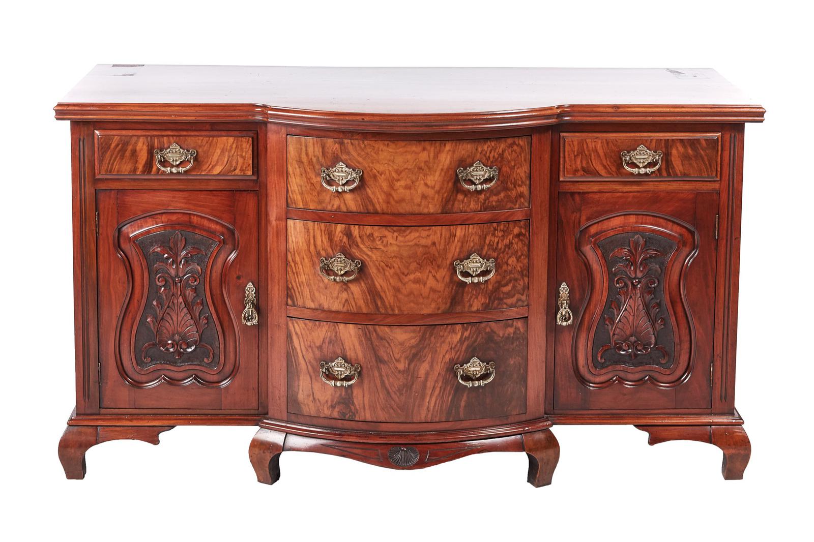 Fantastic quality antique Victorian carved walnut sideboard with a beautiful shaped walnut top, five lovely walnut drawers with original brass handles, two carved solid walnut doors original brass handles opening to reveal a fitted shelf interior. It stands on short shaped solid walnut feet.