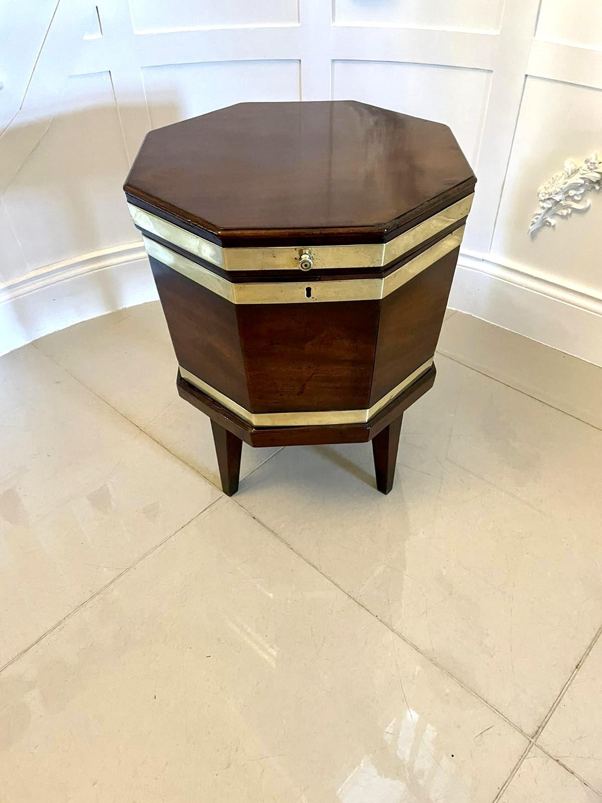 Fine quality 18th Century George III antique mahogany brass bound wine cooler having a quality mahogany hexagonal shaped lift up top opening to reveal the original lead lined interior, 3 original brass bounds, 2 original carrying handles, original brass knob and standing on the original mahogany hexagonal stand with 4 square tapering feet.