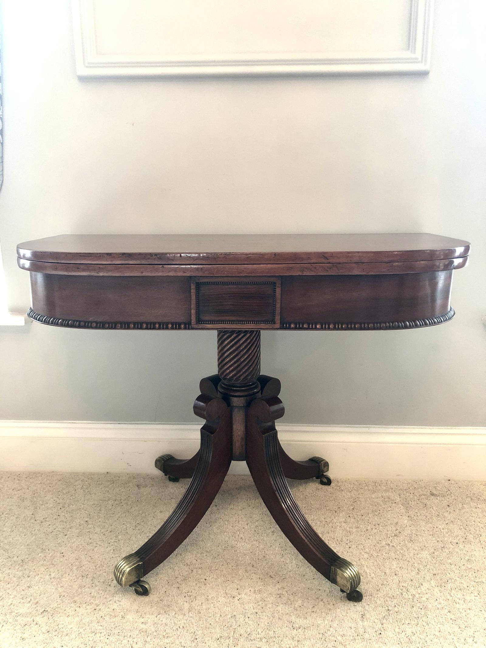 Fine antique Regency mahogany tea table having a fantastic D shaped mahogany top which opens to reveal a beautiful mahogany interior. It boasts a magnificent expertly carved moulded D shaped frieze, supported by a turned elegant ornate column, raised on four scrolled sabre reeded legs and terminating in original brass feet and castors.