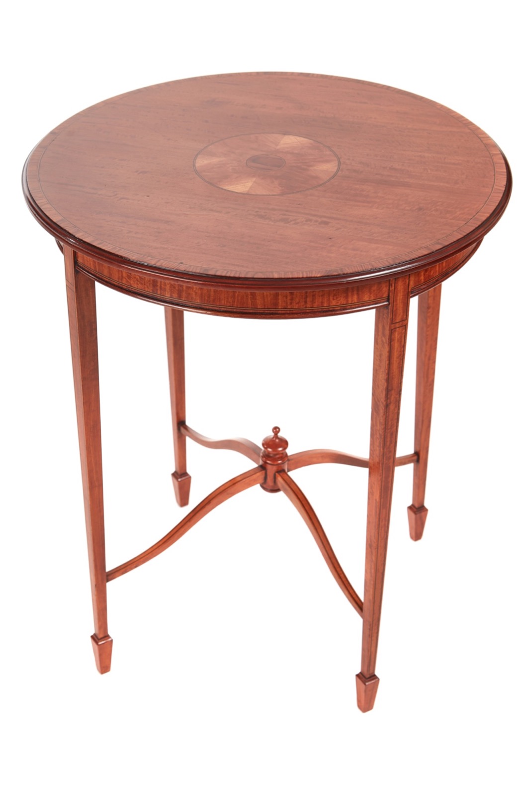 Fine elegant inlaid satinwood round occasional table. This stunning top boasts ebony and satinwood inlay to the centre with satinwood crossbanded edge. It stands on four slim inlaid elegant tapering legs united by shaped cross stretchers which are surmounted by an urn-shaped finial