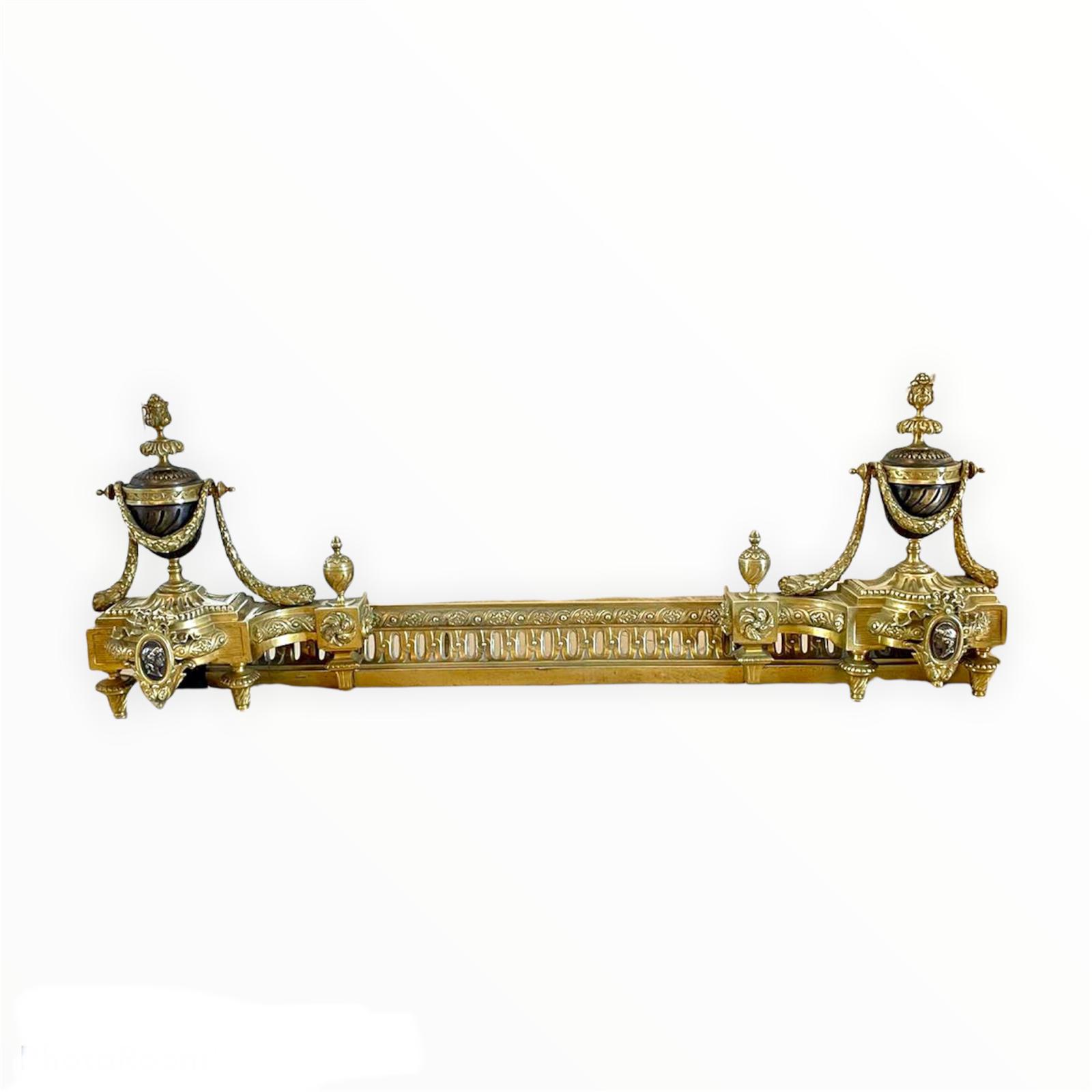 Fine French antique classical gilt bronze ormolu extending fender having outstanding slit, helix and star decoration to the front with a pair of fantastic two tone bronze urns with cameo intaglios and finial tops with ornate shaped feet. Stamped to verso VR/VB.