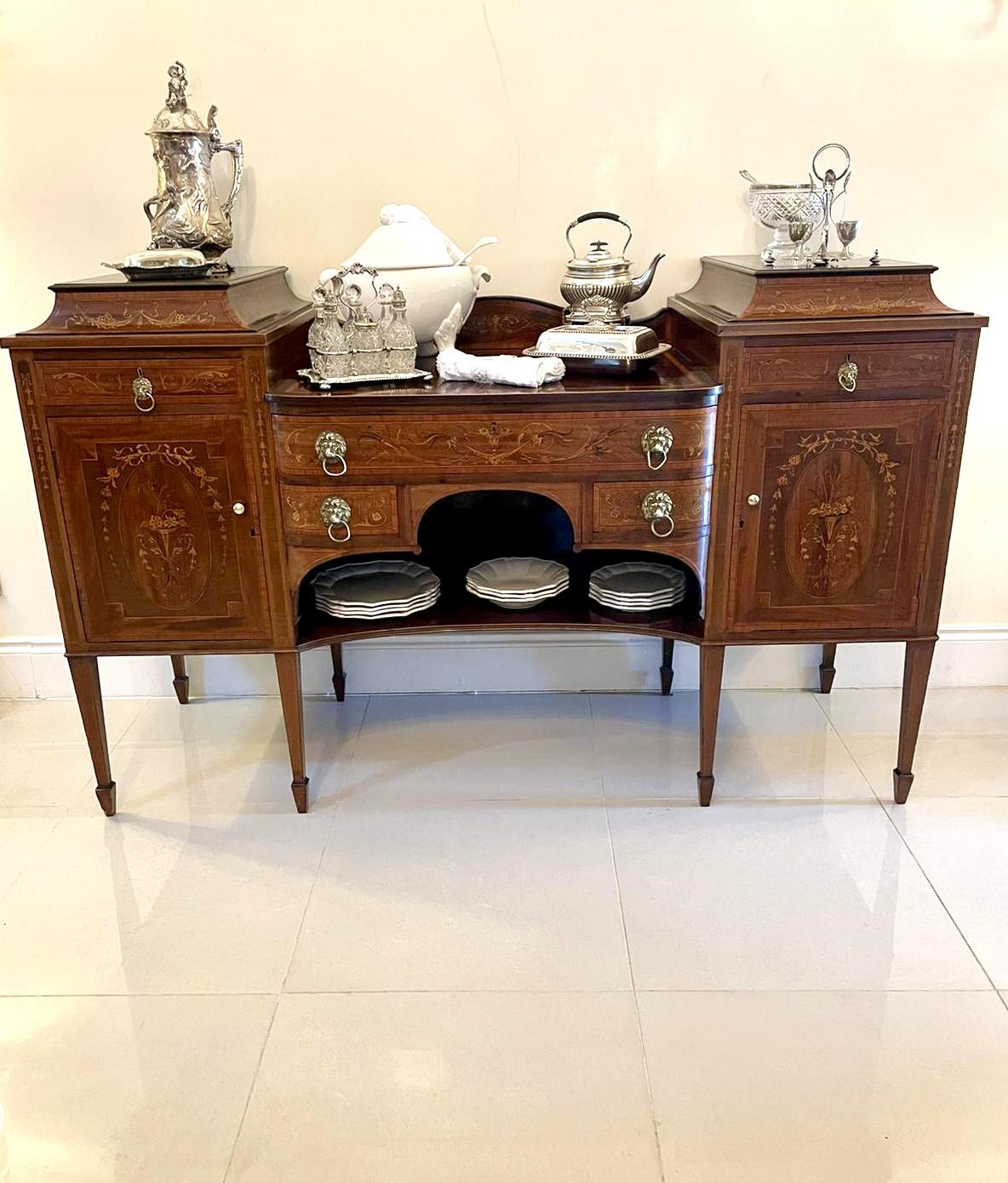 Fine quality 19th century mahogany inlaid marquetry sideboard by Hewetsons, London having a splendid shaped gallery back with satinwood inlay above twin pedestal cabinets with fantastic inlaid marquetry and floral motifs which open to reveal a fitted shelf and a sliding wine tray, two drawers again with incredible inlaid marquetry and original brass lions head handles , three drawers with the same high quality marquetry inlay and original brass lions head handles to the shaped knee hole section. It is raised on superb elegant tapering square legs with spade feet; original keys.
