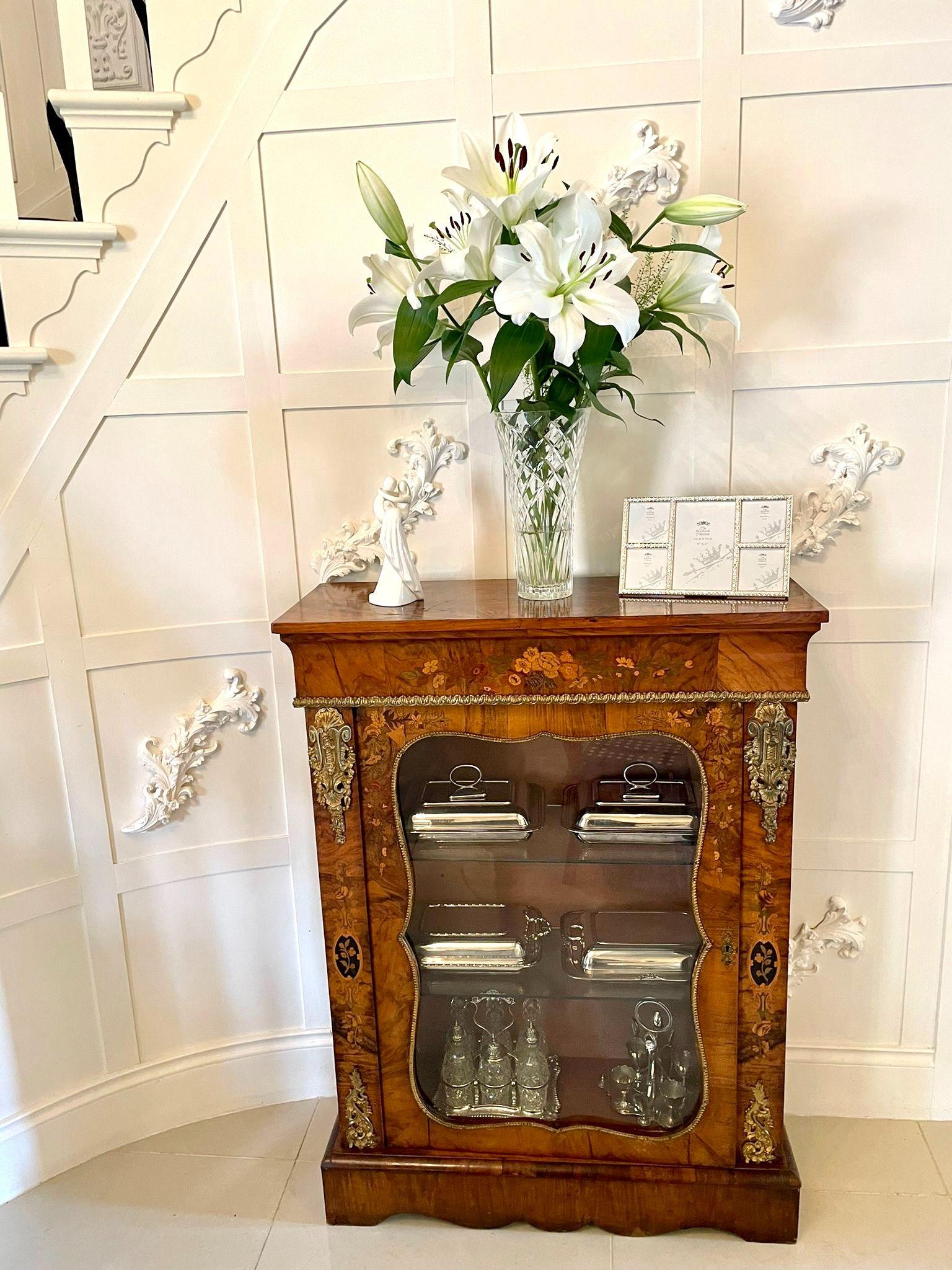 Fine quality antique Victorian burr walnut floral marquetry inlaid display cabinet having a quality burr walnut top and fantastic burr walnut floral marquetry inlaid frieze above a burr walnut floral marquetry inlaid shaped glazed door with ornate gilded brass beading. The door opens to reveal two glass display shelves flanked by outstanding quality ornate ormolu mounts and floral marquetry inlaid to the sides. It stands on a shaped walnut plinth base.