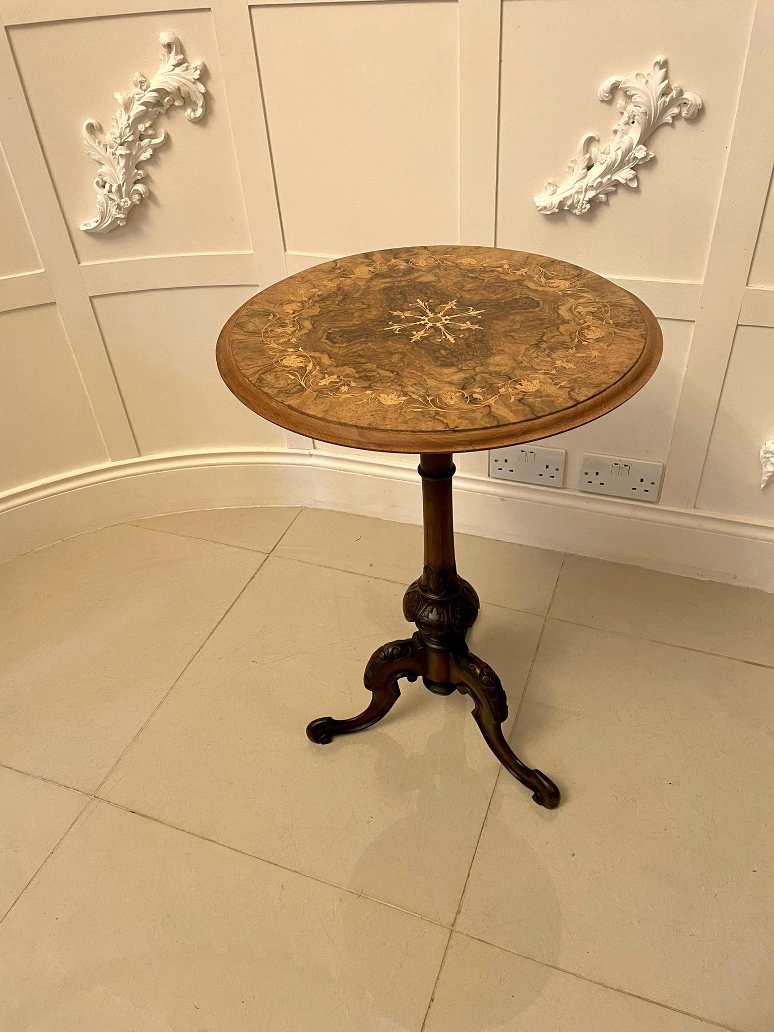 Fine quality antique Victorian burr walnut marquetry inlaid circular lamp table having a fine quality beautiful burr walnut circular top with very attractive satinwood marquetry inlay and a thumb moulded edge supported by a solid carved walnut turned shaped column and raised on three shaped carved solid walnut cabriole legs with scroll feet.