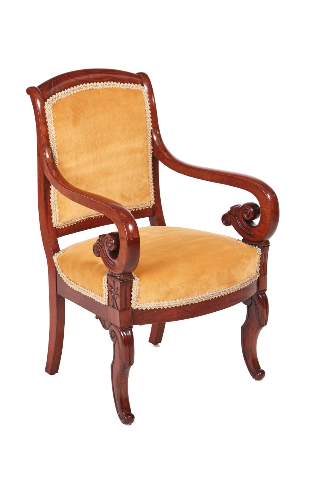 Fine quality mahogany 19th Century Regency antique library chair, a beautiful looking piece with an elegant shaped mahogany framed back, attractive shaped carved scrolled arms, shaped carved cabriole legs to the front and outswept back legs.