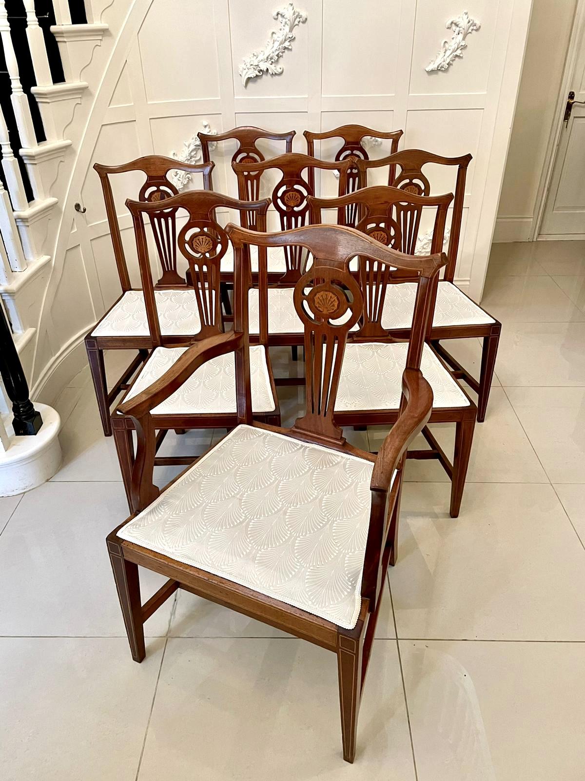 Fine quality set of eight 'George III style' mahogany inlaid dining chairs consisting of one carver chair with shaped open arms and seven single chairs having attractive shaped top rails with impressive quality inlaid shells to the centre splats, inlaid uprights to the back. They are raised on elegant square mahogany tapering legs beautifully inlaid to the front and terminating in spade feet united by H shaped stretchers. Newly re-upholstered in a stylish quality fabric.