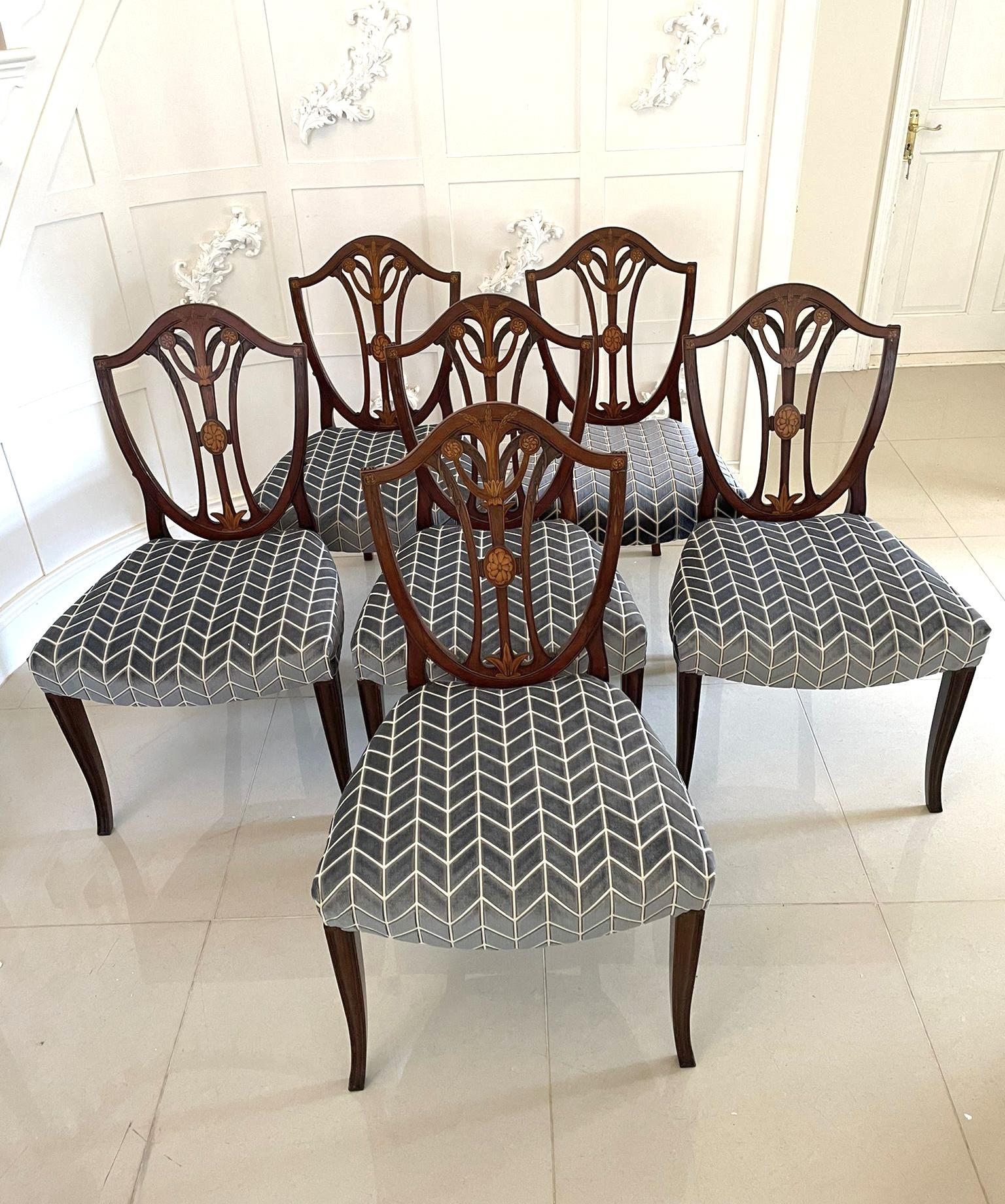 Fine quality set of six antique Victorian mahogany inlaid dining chairs having a fine quality mahogany inlaid back with a shaped top, fantastic pierced carved satinwood inlaid centre splat, newly reupholstered seats in a quality fabric and standing on moulded spade legs to the front out swept back legs.