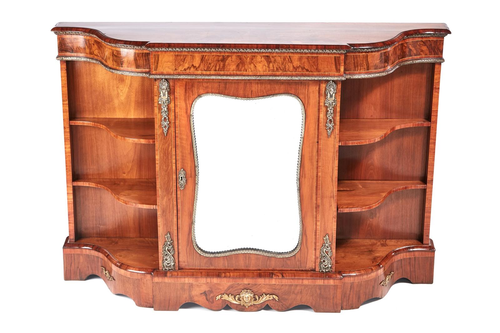 Fine quality Victorian burr walnut credenza with a fantastic quality serpentine top and kingwood crossbanded frieze and beautiful ormolu mounts. The centre door has the original shaped mirror. It boasts wonderful serpentine open ends and stands on a shaped plinth base with ormolu mounts.
