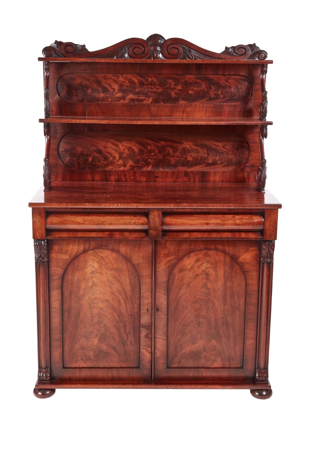 Fine Regency antique carved mahogany chiffonier, beautifully carved back with two shelves and carefully carved attractive supports. The base has two shaped frieze drawers with two flame mahogany doors with arced panels, pretty carved corbels, one shelf inside, standing on a plinth base with original bun feet.