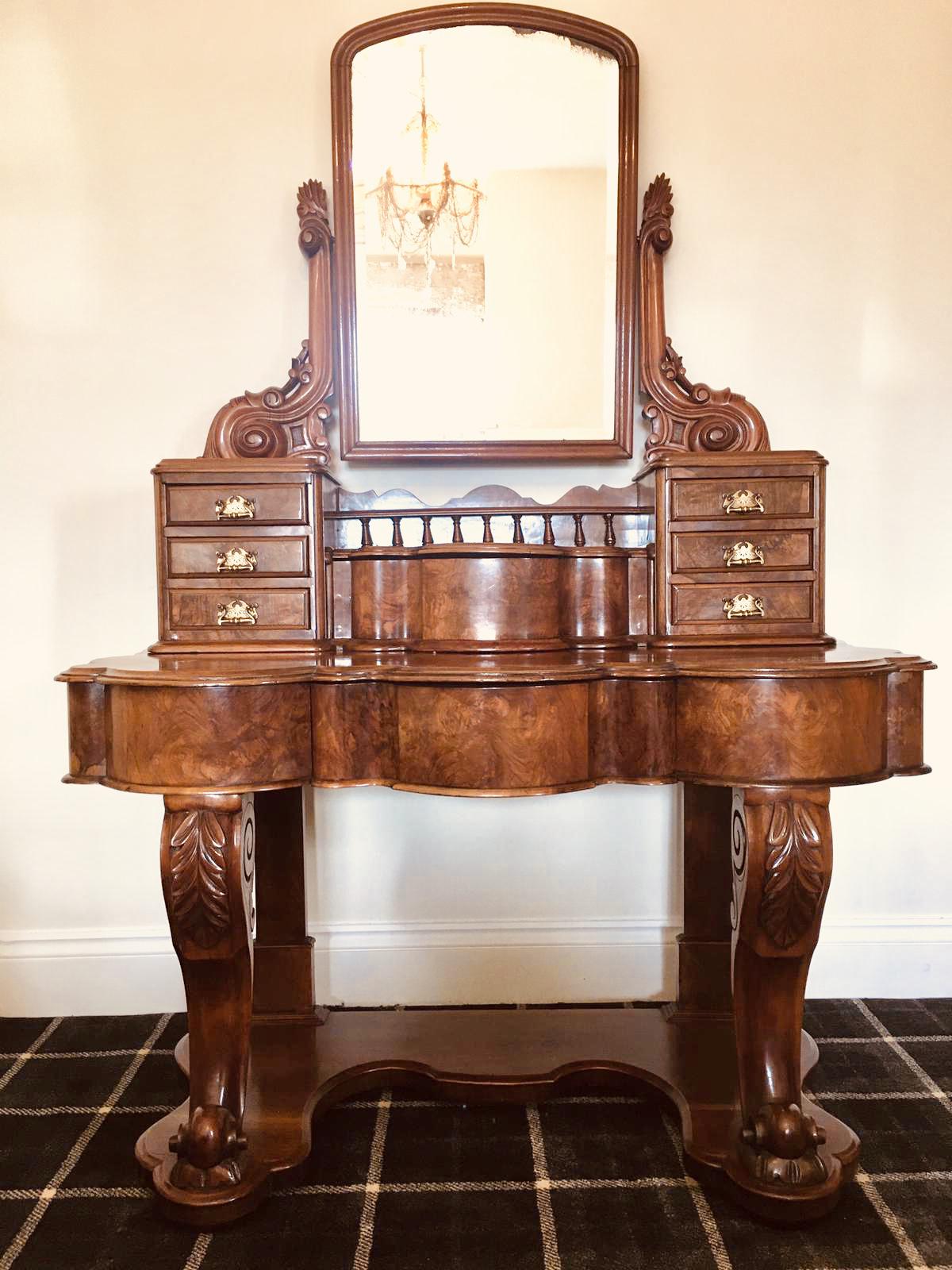 A fine Victorian burr walnut dressing table having a beautiful shaped tilting mirror to the top section supported by two carved walnut arms above six elegant burr walnut drawers with original brass handles. It boasts a shaped walnut compartment with a lift up lid. The base has a magnificent burr walnut shaped top with a double moulded edge, a pretty burr walnut shaped frieze with a drawer to the centre. It stands on two attractively shaped carved cabriole legs to the front and two solid walnut back legs which are united by a shaped under tier base with a moulded edge and raised on four small bun feet.